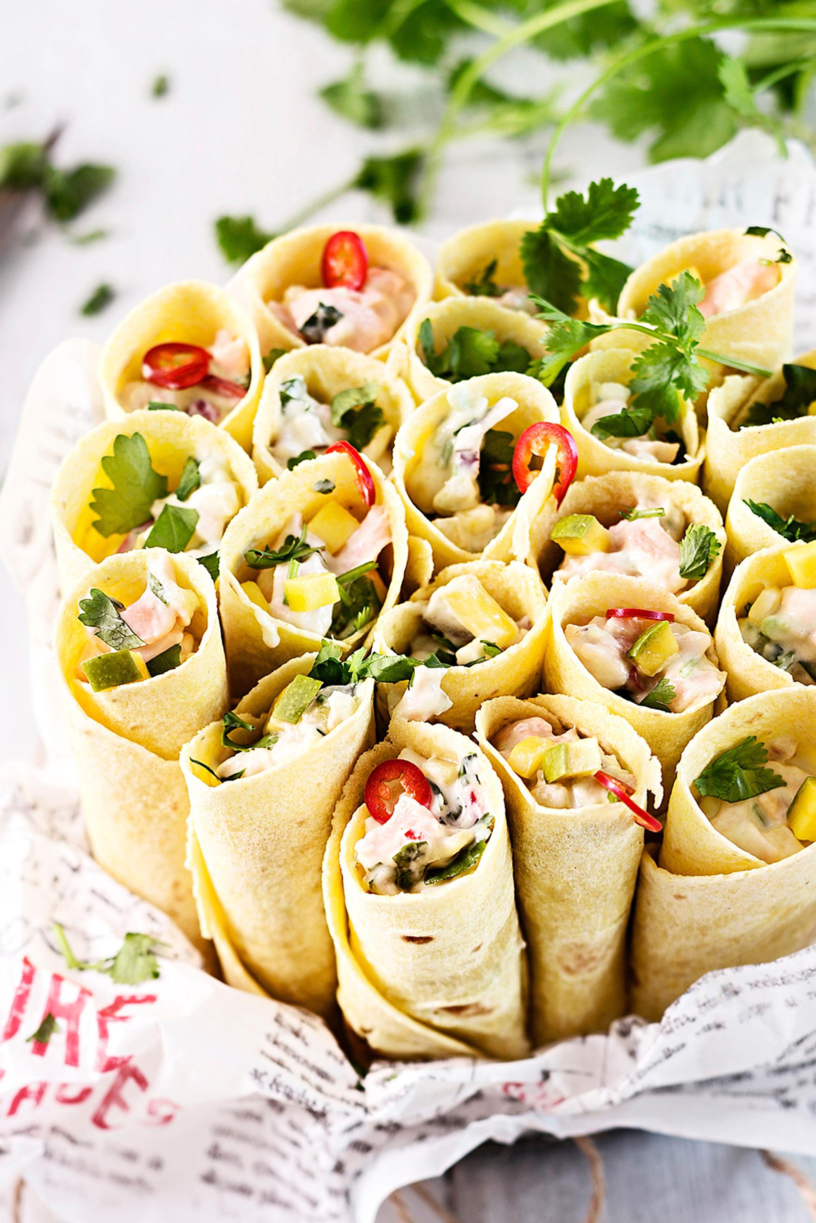 - Levitä tortillat työpöydälle ja jaa täyte niihin tasaisesti. Rullaa tortillat tiukoiksi rulliksi ja leikkaa ne keskeltä puoliksi.