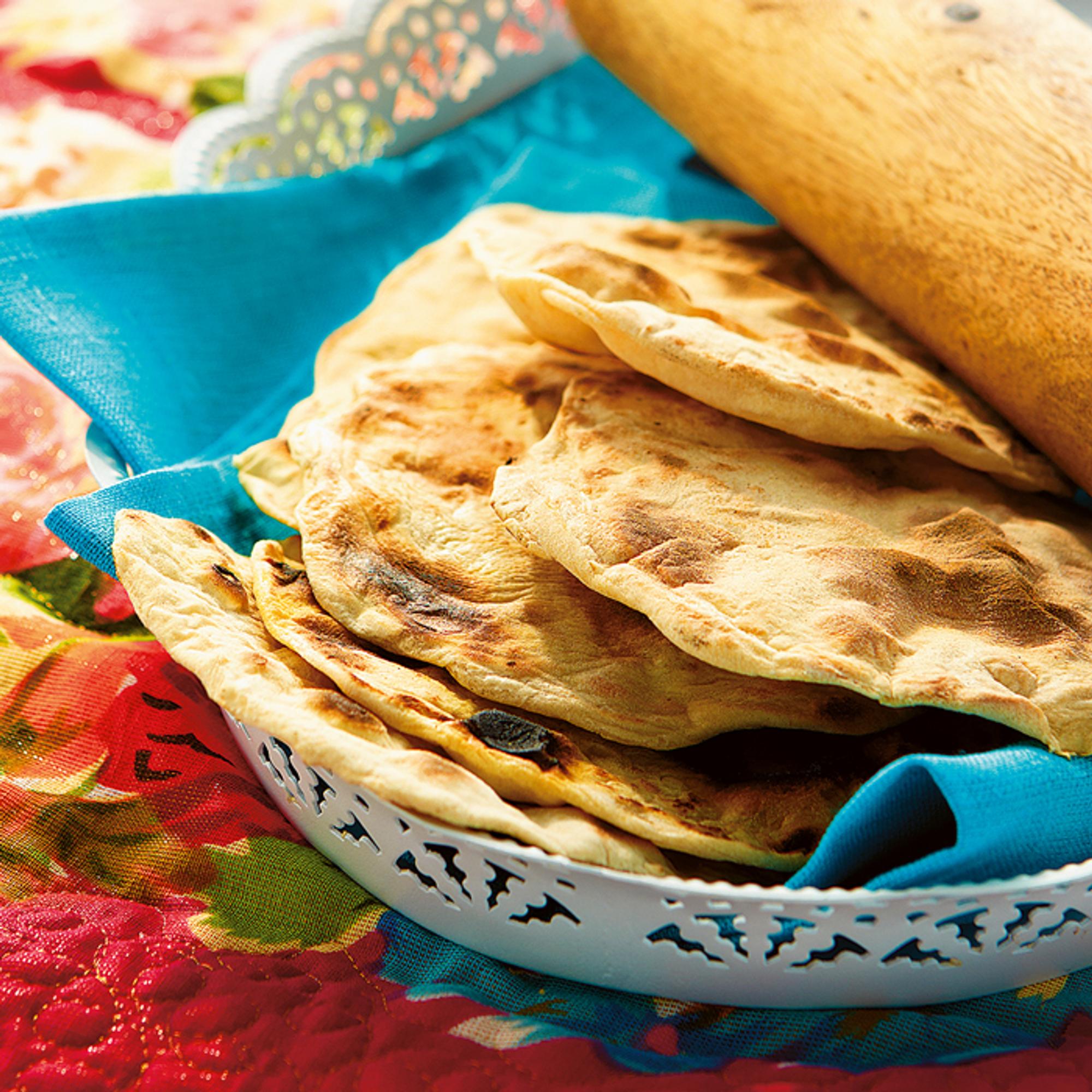 - Paista kuumassa, kuivassa valurautapannussa puoli minuuttia per puoli, kunnes pinta on ruskean laikukas. Painele leipää paistamisen aikana puhtaalla, taitetulla keittiöpyyhkeellä keskeltä reunoille päin, jolloin chapati-leipään jää sopivasti ilmaa.