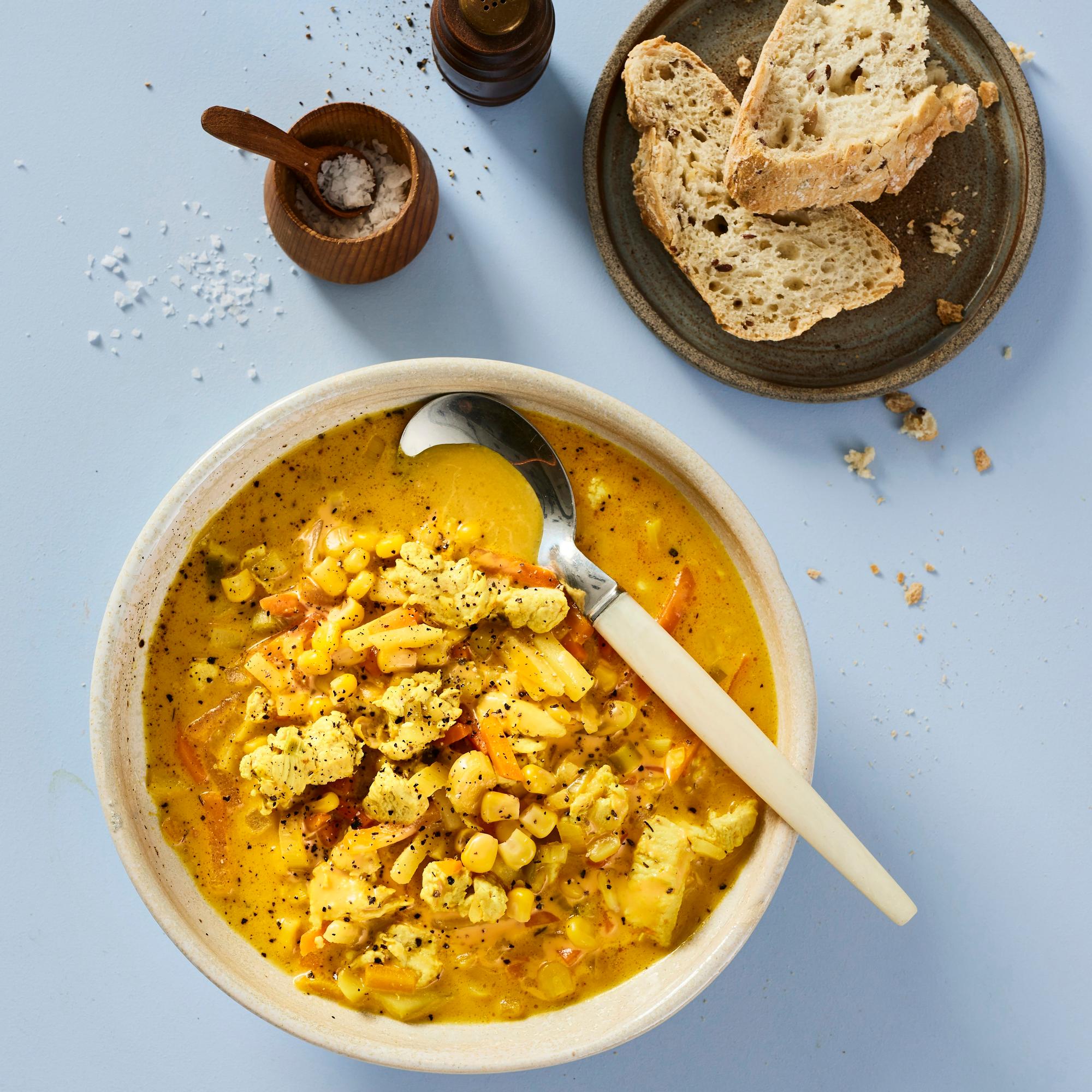 Amerikkalaisen chowder-kanakeiton juustoisempi versio valmistuu pikana, kun otat avuksi pakastekasvissuikaleet ja valmiin cheddarjuustodipin.