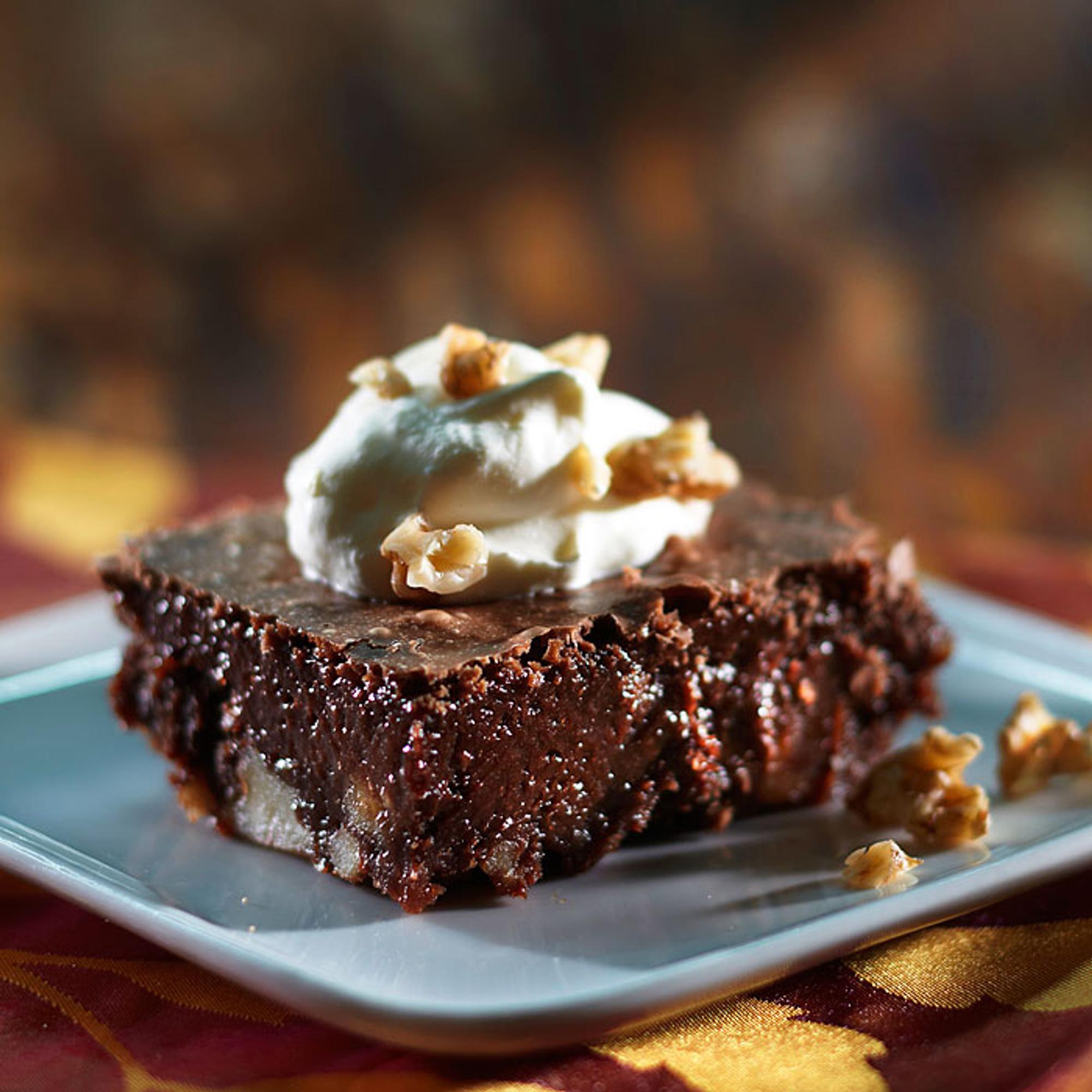 Voitele ja jauhota suorakaiteen muotoinen vuoka (20 × 30 cm). Sulata paloiteltu suklaa ja voi miedolla lämmöllä pinnoitetussa kattilassa. Anna jäähtyä hieman. Rouhi saksanpähkinät. Vatkaa munat ja sokeri kuohkeaksi vaahdoksi. Yhdistä suklaa-voiseos munasokerivaahtoon. Kumoa rouhitut saksanpähkinät ja vehnäjauhot taikinan joukkoon ja sekoita tasaiseksi. Kaada taikina vuokaan. Paista 150-asteisessa uunissa noin 40 minuuttia. Anna chjokobrownien jäähtyä hyvin. Leikkaa suklaakakkulevy pieniksi paloiksi ja tarjoa esimerkiksi kermavaahdon ja marjojen kera.