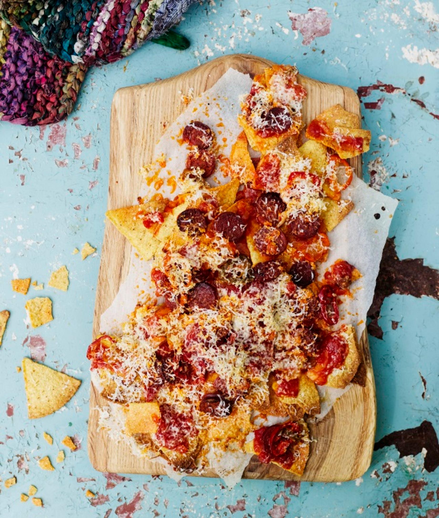 - Paista nachot 225-asteisessa uunissa tai grillissä keskilämmöllä kuvun alla noin 10 minuuttia, kunnes juusto on sulanut. Tarjoile chorizo-nachot rentona sormin syötävänä ruokana.
