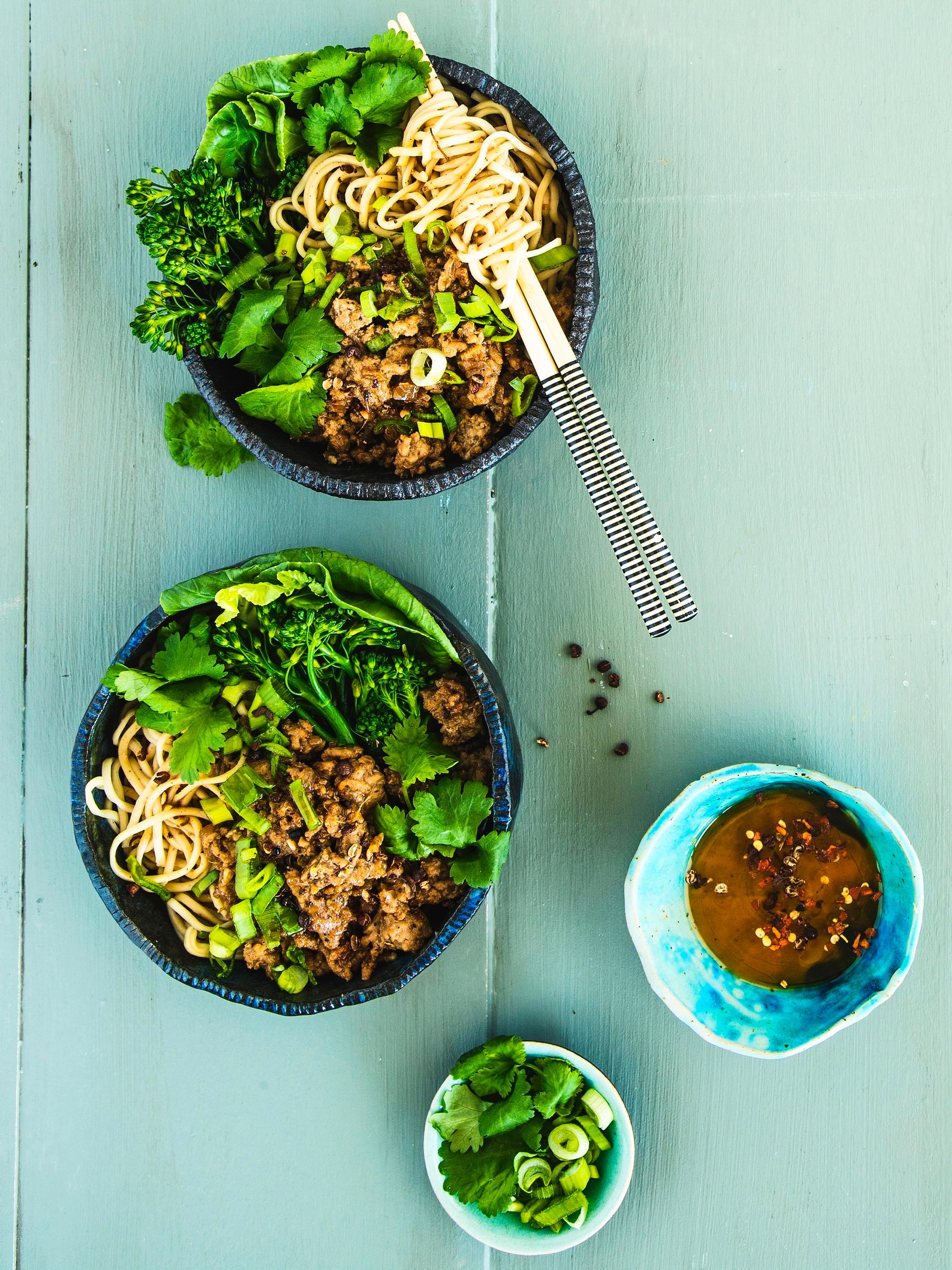 - Paloittele paksoi. Jaa nuudelit, varsikaalit, paksoit ja jauheliha lautasille. Kauho päälle kuumaa lientä. Viimeistele annokset hienonnetulla kevätsipulilla ja korianterilla. Tarjoa halutessasi lisäksi chiliöljyä.