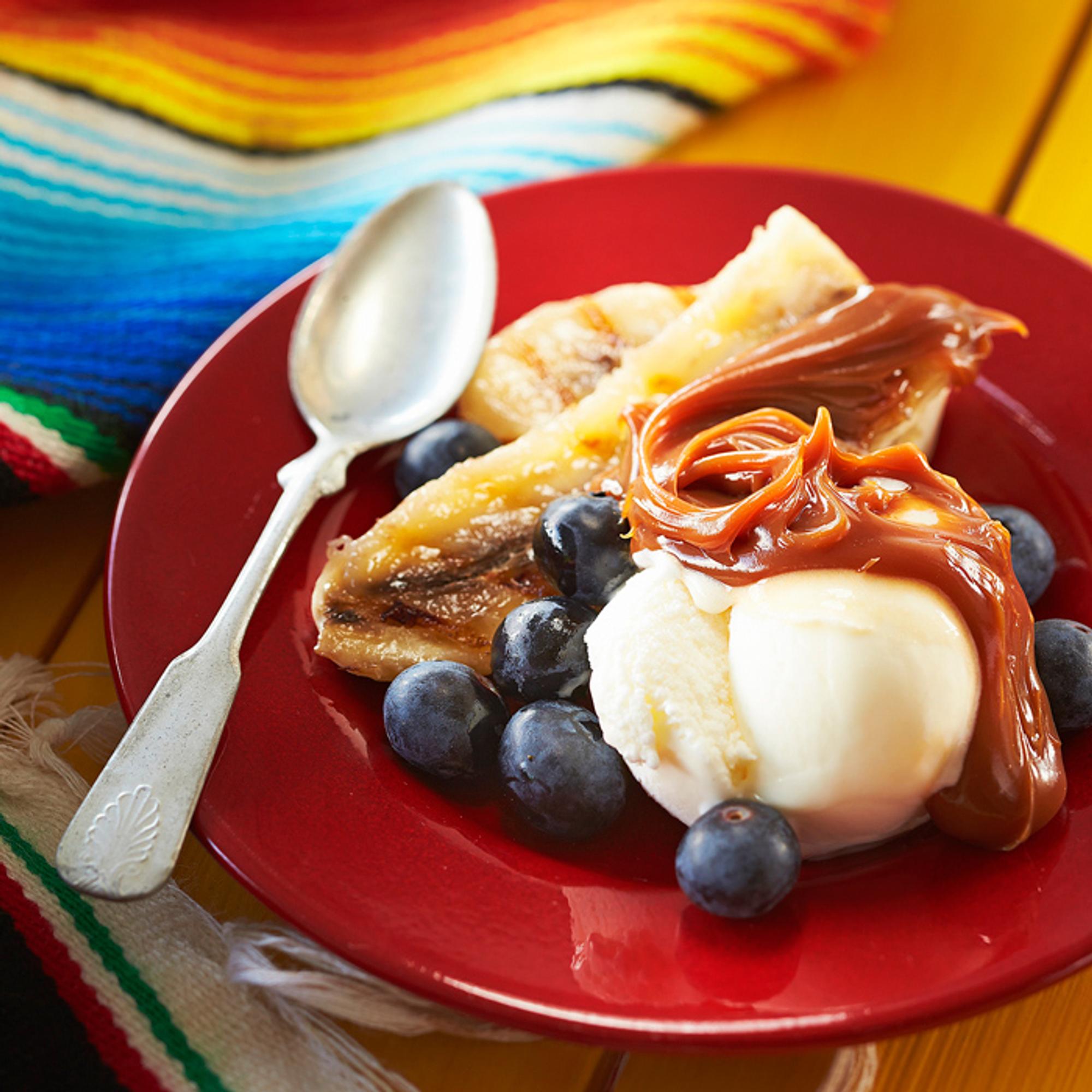 Pyöräytä jokaiseen annokseen vaniljajäätelöpallo. Viimeistele dulce de leche -jälkiruoka argentiinalaisten rakastamalla toffeekastikkeella, dulce de lechellä eli keitetyllä kondensoidulla maidolla.
