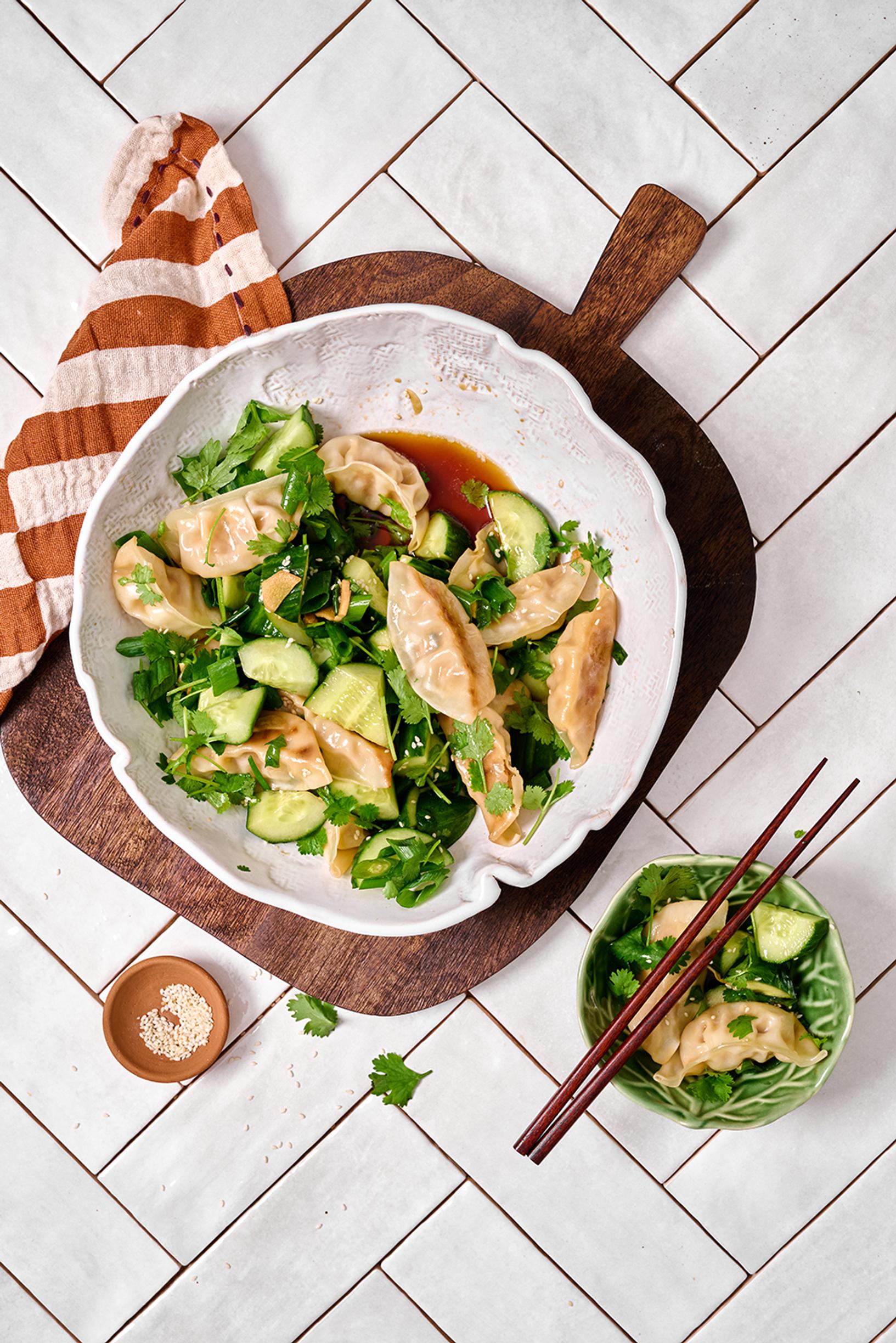 Pakastealtaan dumplingeista valmistuu raikas salaatti kurkun, kevätsipulin ja korianterin kanssa. Mausteisen makea kastike marinoi kaikki ainekset ihanaksi.
