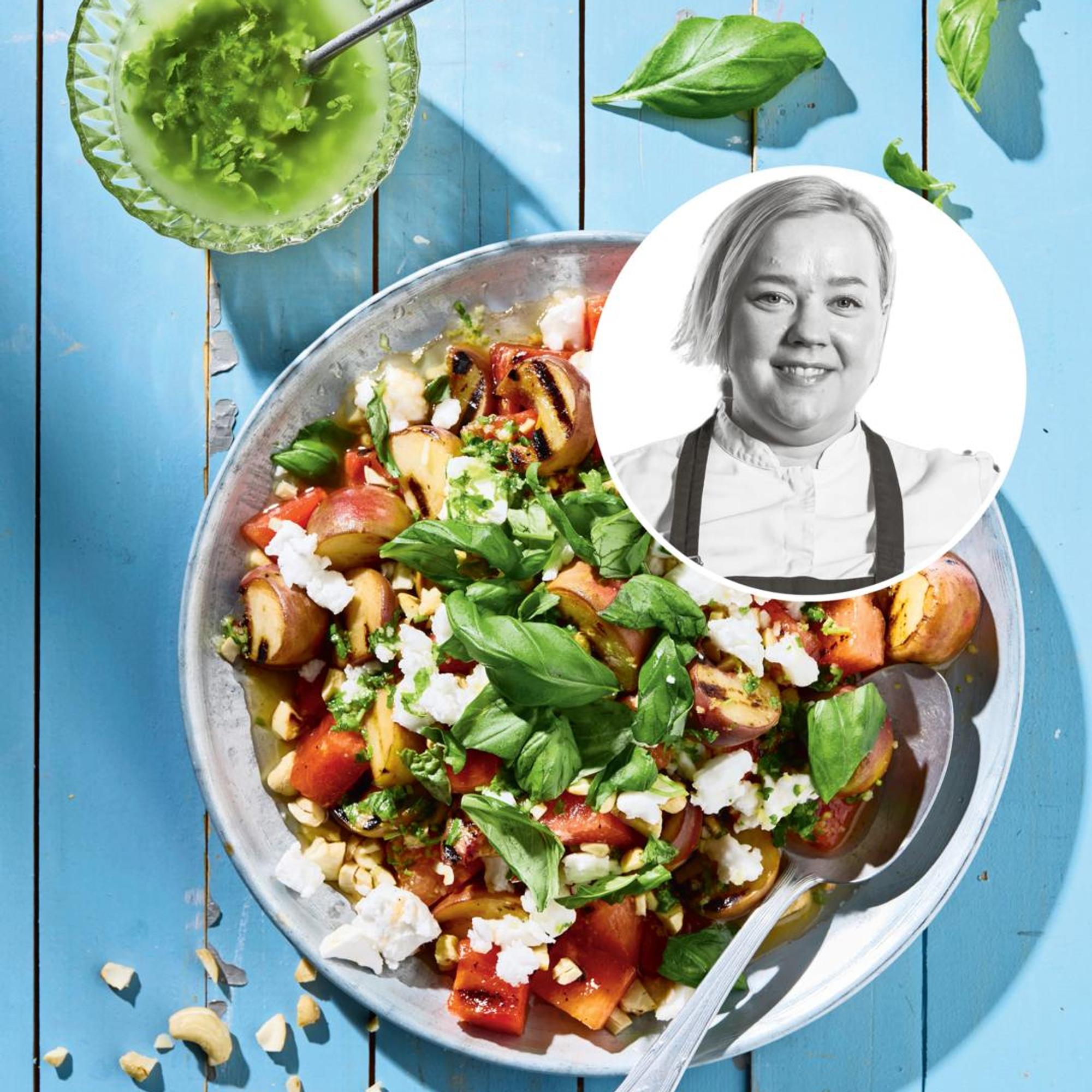 Keittiömestari Eeva Hongiston grillattu vesimeloni-persikkasalaatti – virkistävä vegaaninen kesäsalaatti kiepsahtaa grillin kautta pöytään