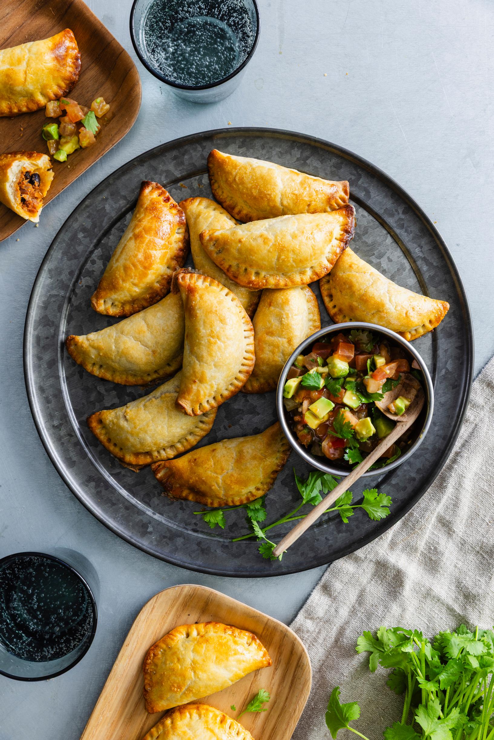 Empanadat ovat klassinen sormisyötävä, joka saa nyt uuden täytteet: tonnikala, mustapavut ja mausteet kietoutuvat mehevään pakettiin. Empanadat maistuvat yhtä hyvin lämpiminä kuin kylminä ja sopivat niin juhlapöytään kuin retkievääksi. Tarjoa empanadojen kanssa raikasta pico de gallo -tuoretomaattisalsaa tai pyöräytä dipiksi avokadoista guacamole.