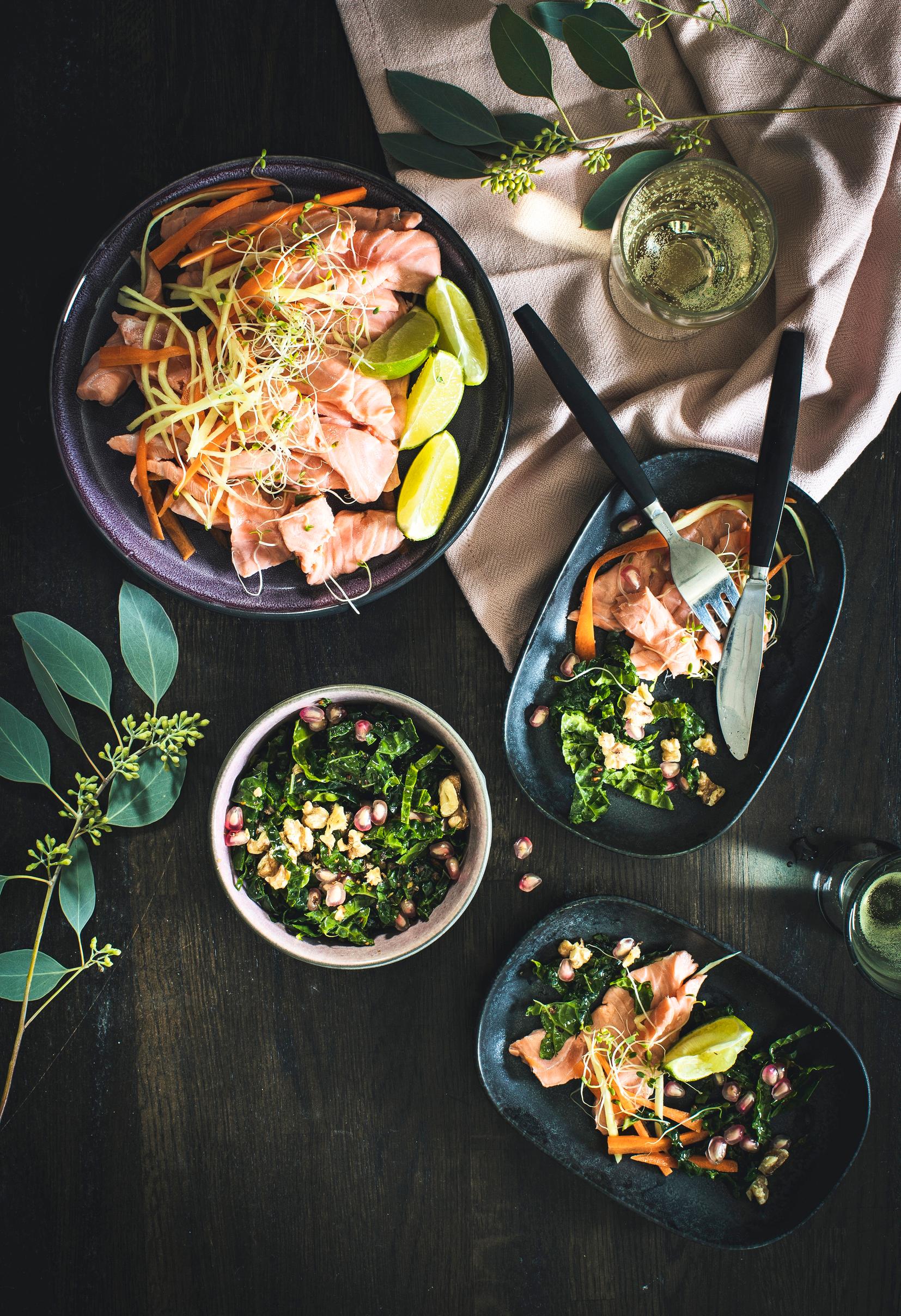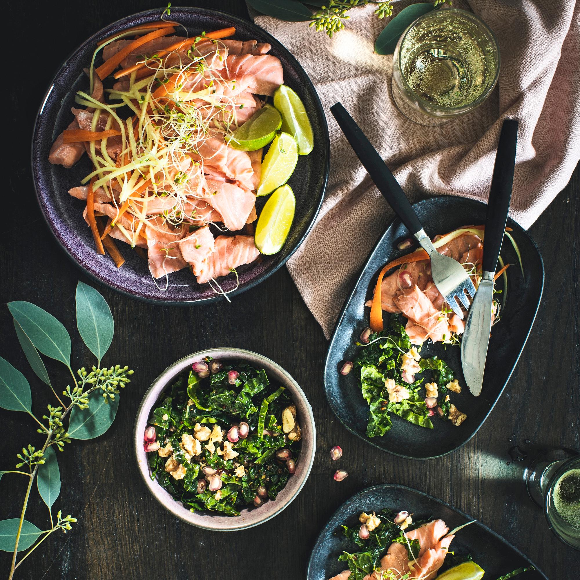 - Leikkaa lohi viipaleiksi riveihin. Leikkaa porkkana ja inkivääri ohuiksi suikaleiksi lohen päälle.