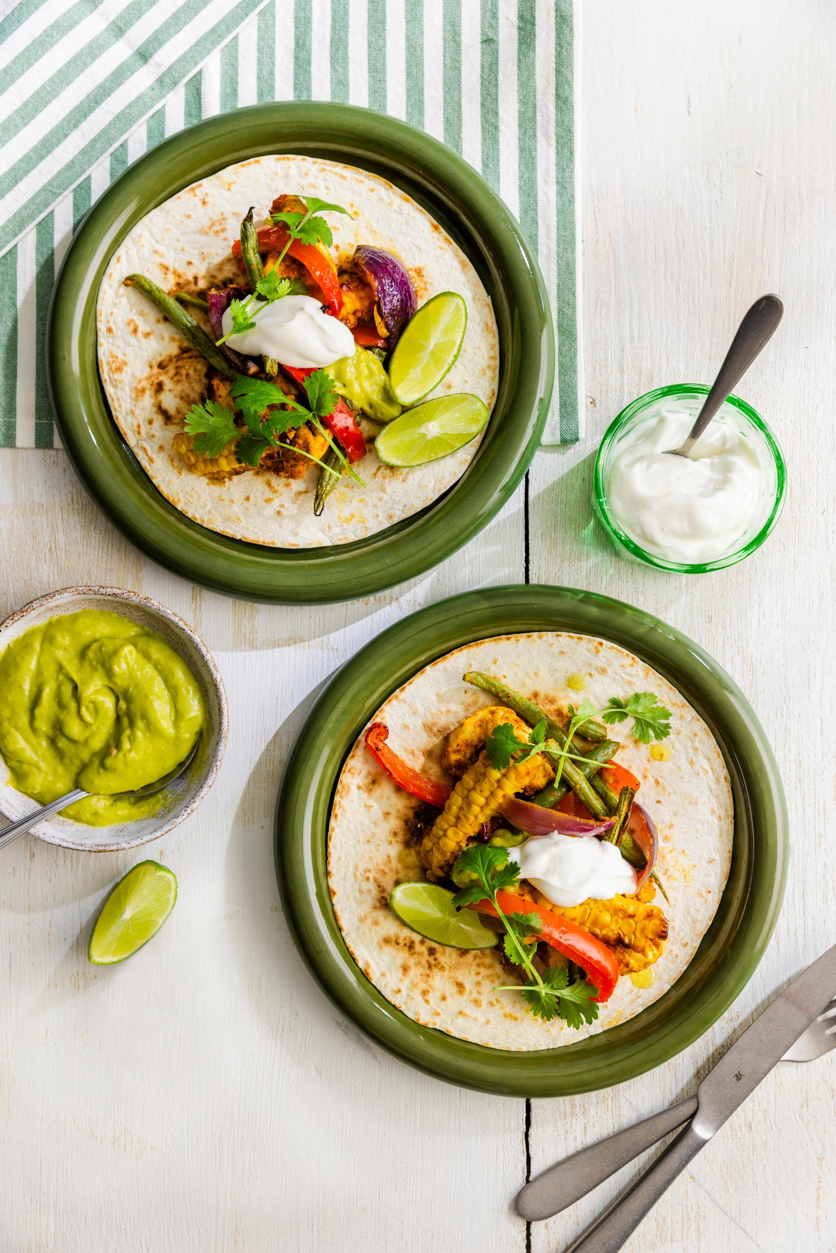 - Lämmitä tortillat esimerkiksi mikroaaltouunissa ja tarjoa kasvis-broileriseoksen sekä guacamolen ja ranskankerman sekä limen lohkojen kanssa.