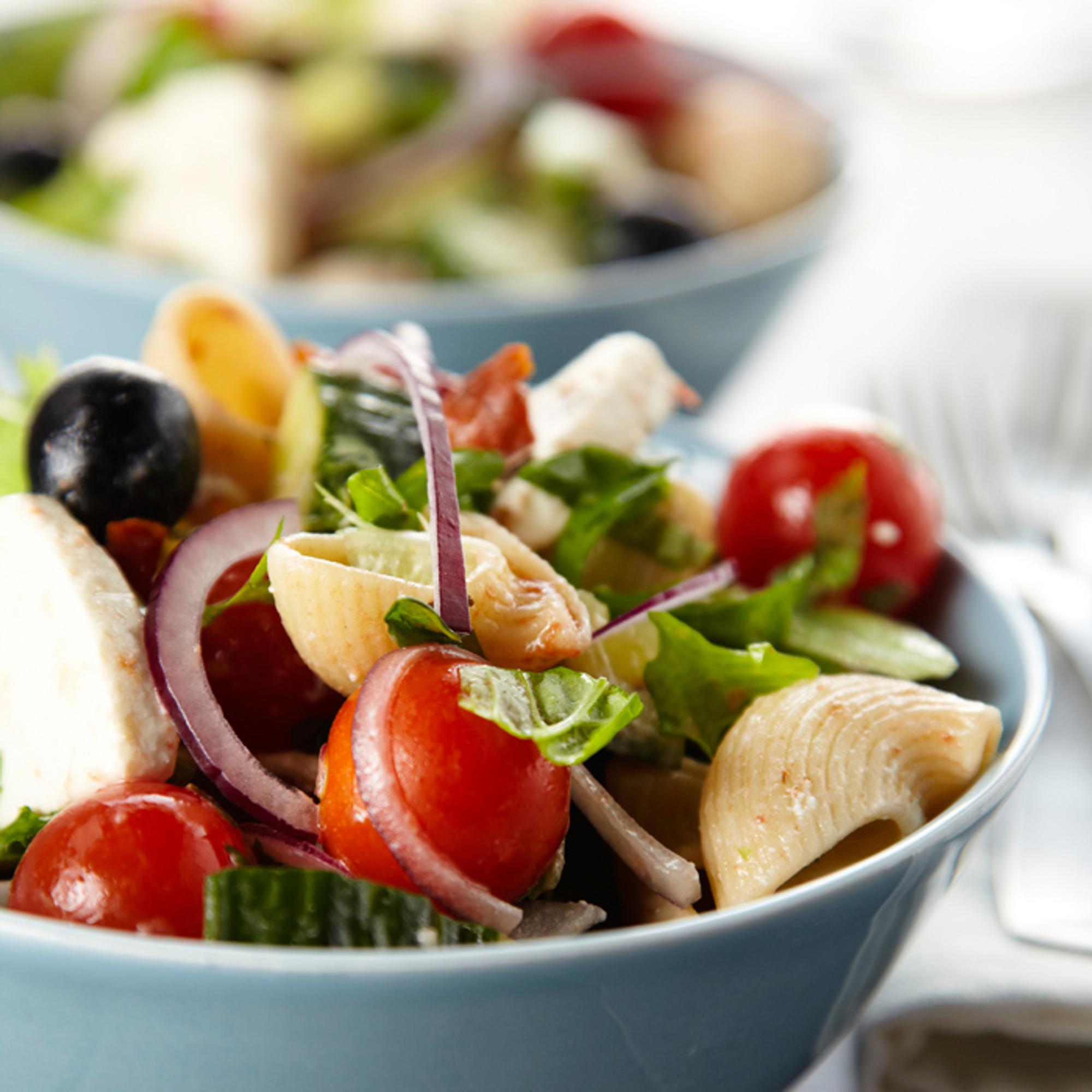 Etsitkö helpon Välimerellisen salaatin ohjetta? Tämä feta-pastasalaatti sopii niin rennoksi juhlatarjottavaksi kuin raikkaaksi lounaaksikin!