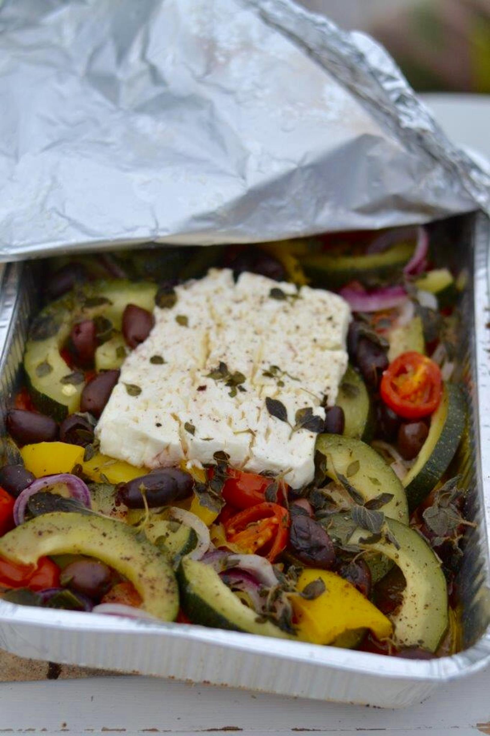 Puolita kesäkurpitsa ja poista siemenet. Viipaloi kesäkurpitsa ja punasipuli. Poista paprikasta kanta ja siemenet, leikkaa lohkoiksi. Puolita miniluumutomaatit pituussuunnassa. Laita kasvikset foliovuokaan. Lisää vuokaan oliivit, fetajuusto ja yrtit. Mausta suolalla ja pippurilla. Ripottele pinnalle oliiviöljyä. Peitä vuoka foliolla. Nosta kasvisvuoka grilliin ja anna olla noin 20 minuuttia tai kunnes kasvikset ovat kypsiä. Tarjoile grilliruoan lisukkeena.