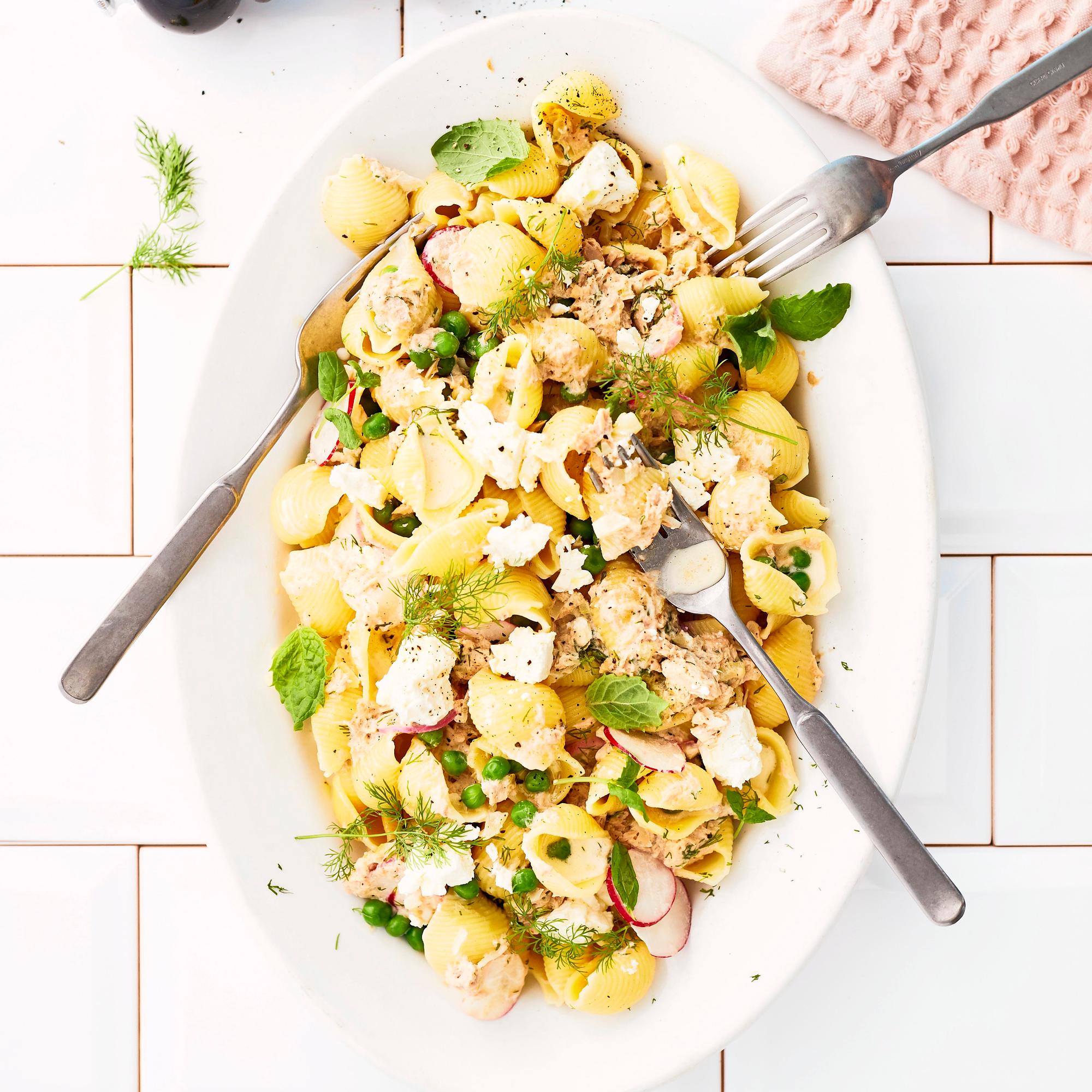 Fiinimpi tonnikalapasta sopii niin arkeen kuin juhlaankin. Valkoviini, tuoreet yrtit ja päälle murusteltu feta kohottavat purkkitonnikalasta loihditun pikapastan aivan uudelle tasolle.