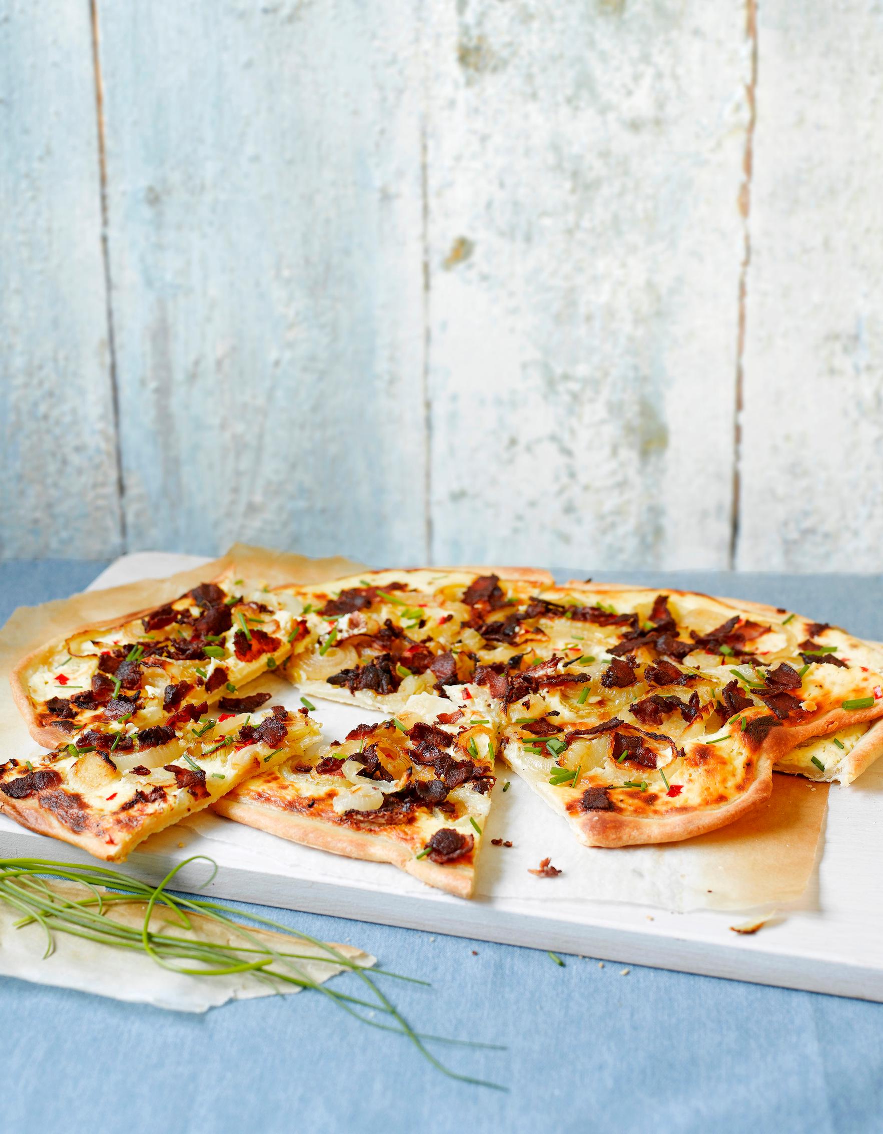 Trendikäs flammkuchen tehdään hiivattomasta vehnätaikinasta. Pane liekkileivän päälle pekonia, ohuita sipulirenkaita ja chiliä.