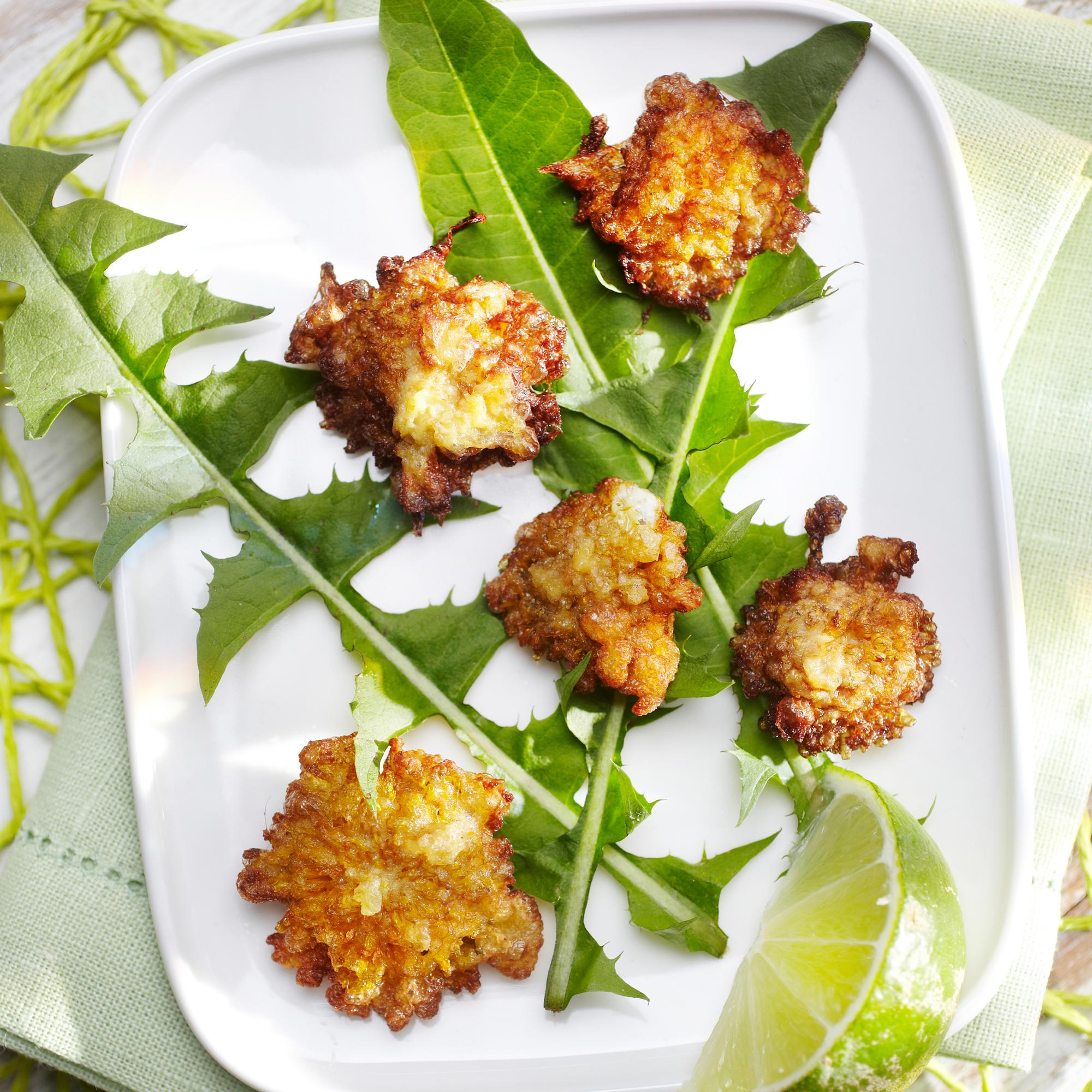 - Tee lautasille voikukanlehdistä peti ja asettele friteeratut voikukat petin päälle. Tarjoa dippikastikkeen kanssa alkuruokana tai pikkunaposteltavana.