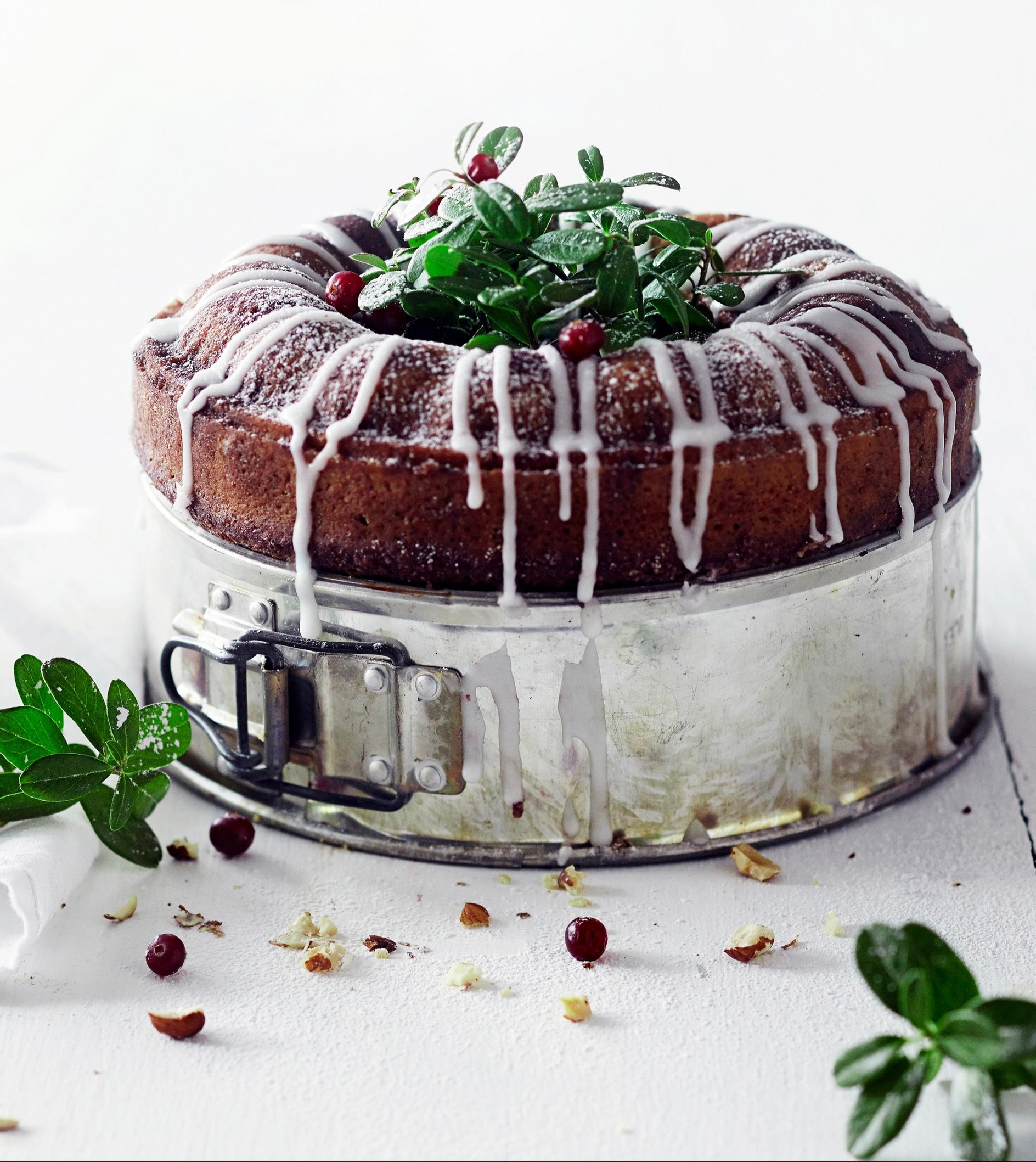 - Voitele ja korppujauhota 3 litran kakkuvuoka. Kaada taikina vuokaan ja kypsennä 175-asteisessa uunissa noin 50 minuuttia. Tarkista kypsyys cocktailtikulla. Anna jäähtyä hetki ennen kumoamista.