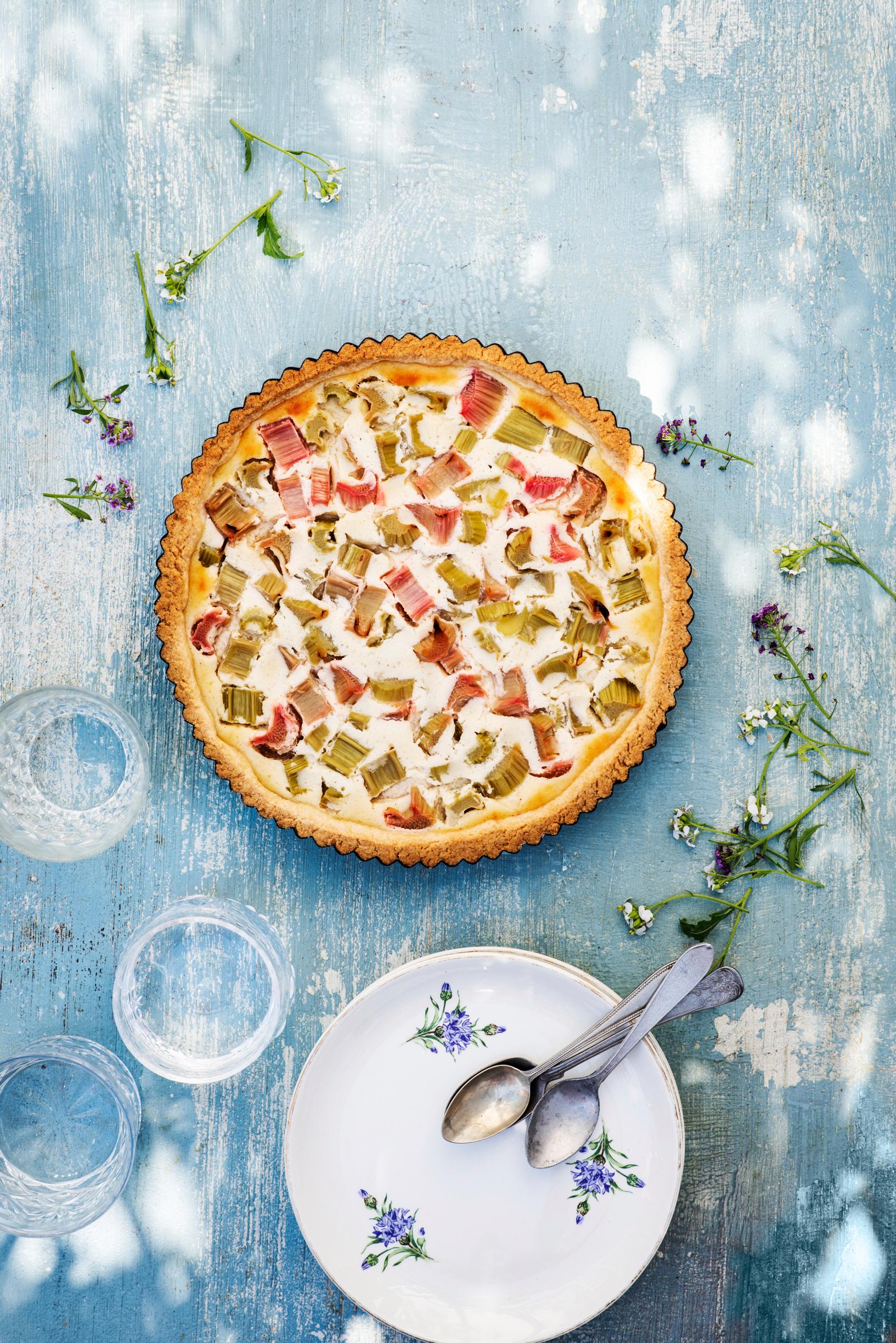 - Sekoita ranskankerma, muna ja sokerit keskenään. Kaada täyte piirakkapohjan päälle ja ripottele päälle raparperin palat.