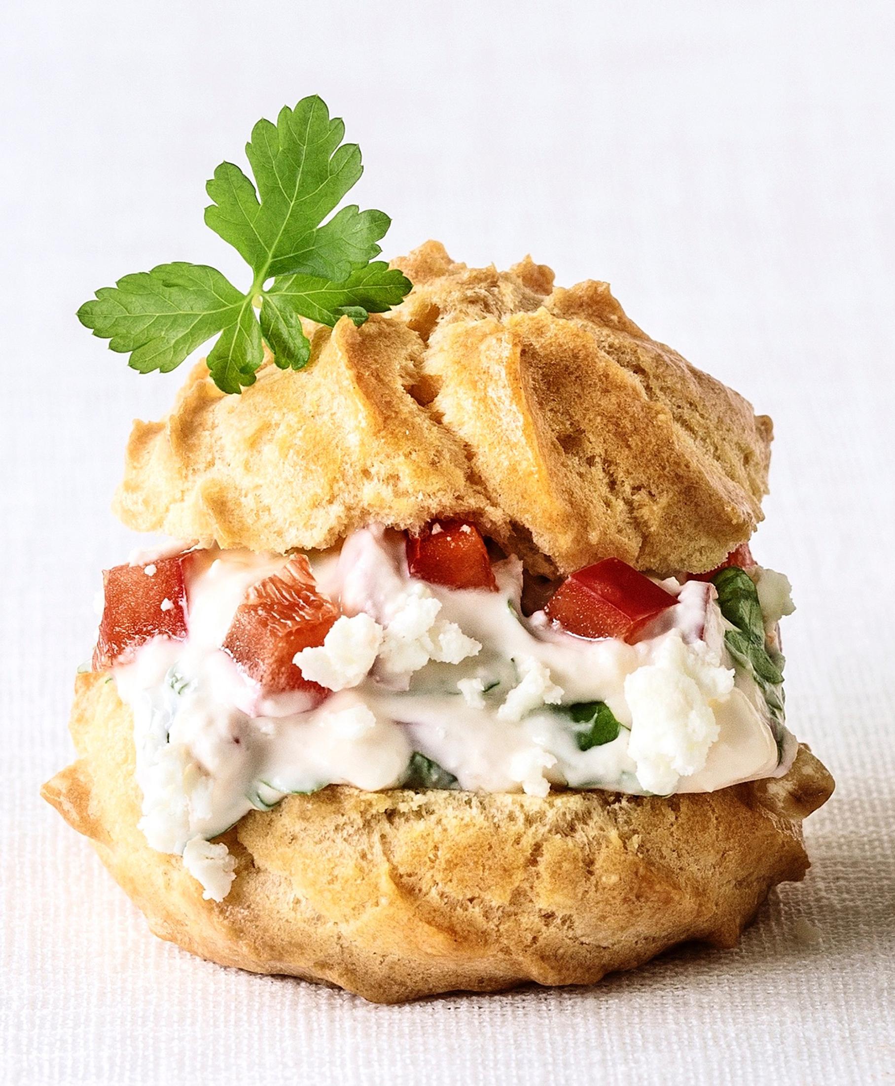 Gluteenittomat tuulihatut saavat mehevän valkosipulitäytteen, joka viimeistellään paprikapaloilla ja persiljalla.