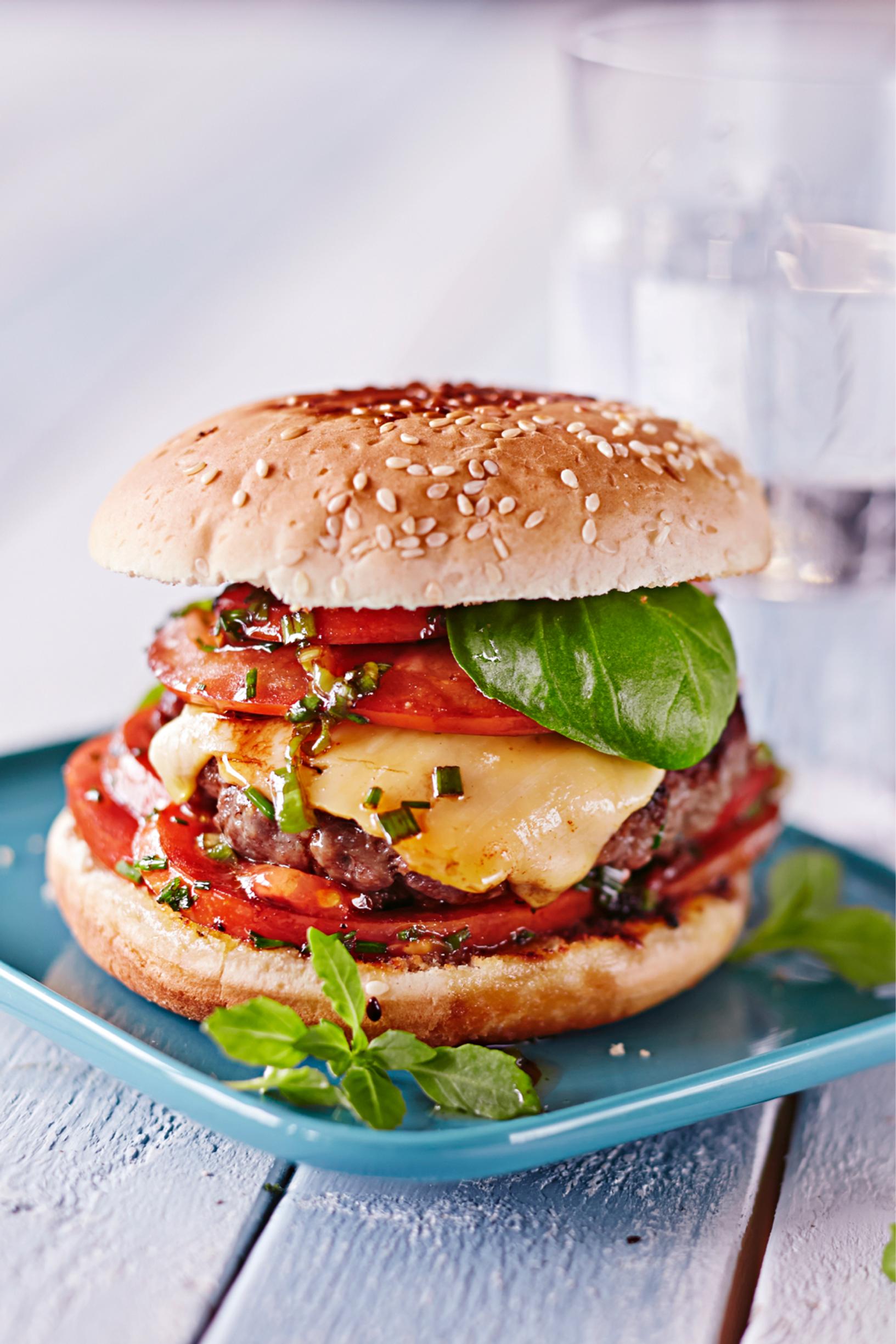 Kesäisin hampurilainen tulee grillistä! Valmista hampurilaisten väliin juustolla viimeistellyt mehevät pihvit ja raikasta tomaatti-sipulisalaattia.