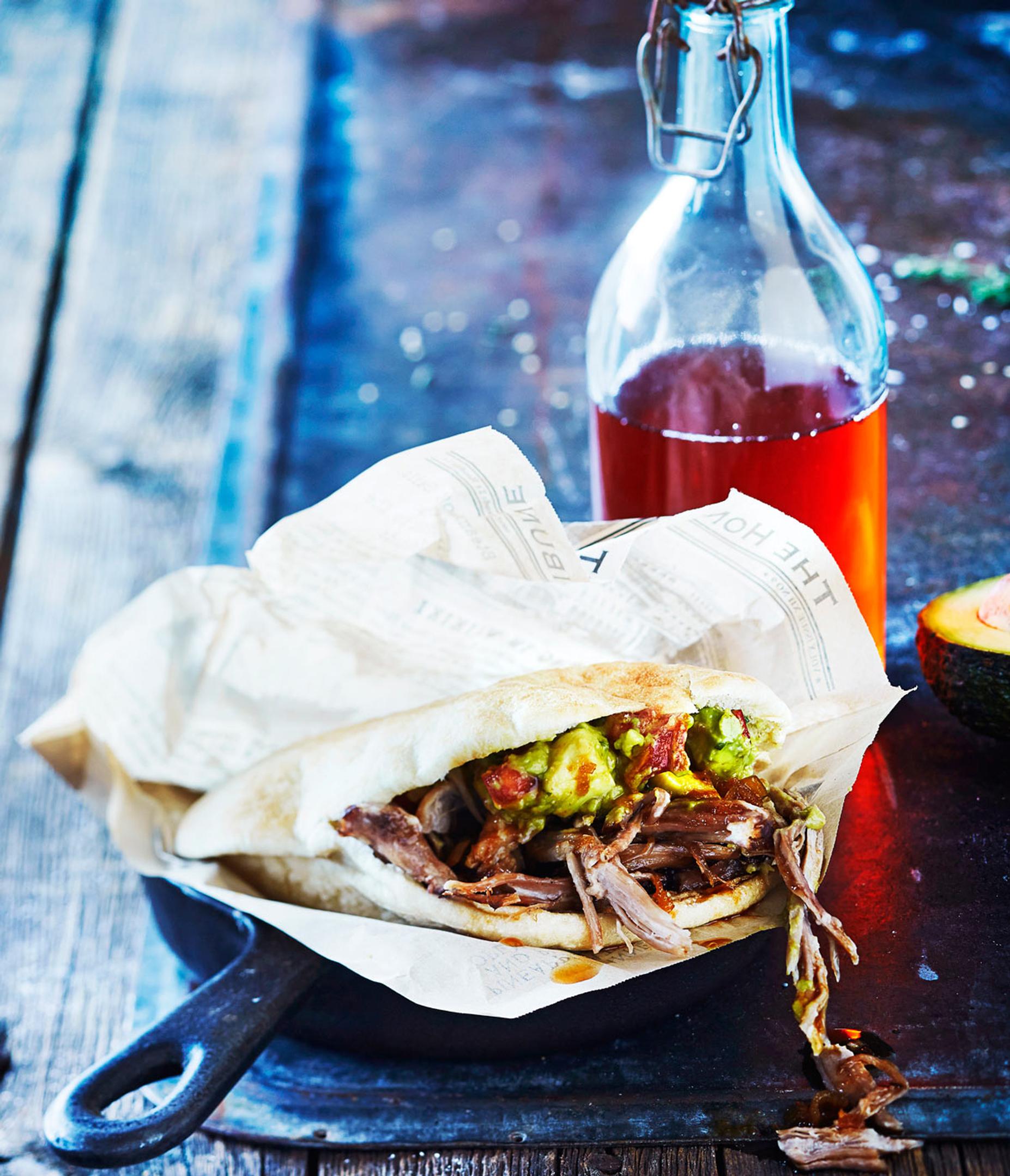 Kokoa pitaleivän väliin grillattua nyhtöpossua ja tomaattista guacamolea. Valmistus vie aikaa, mutta lopputulos palkitsee kokkaajan ja herkuttelijat!
