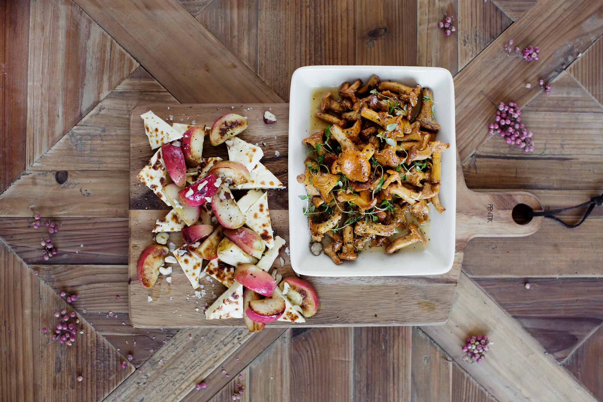 - Leikkaa omenat lohkoiksi ja poista keskiosa. Grillaa tai paista omenalohkot nopeasti öljyssä. Ripottele niiden pinnalle suolaa ja mustapippuria. Nosta grillatut omenat leipäjuuston päälle. Koristele annos halutessasi hasselpähkinöillä.