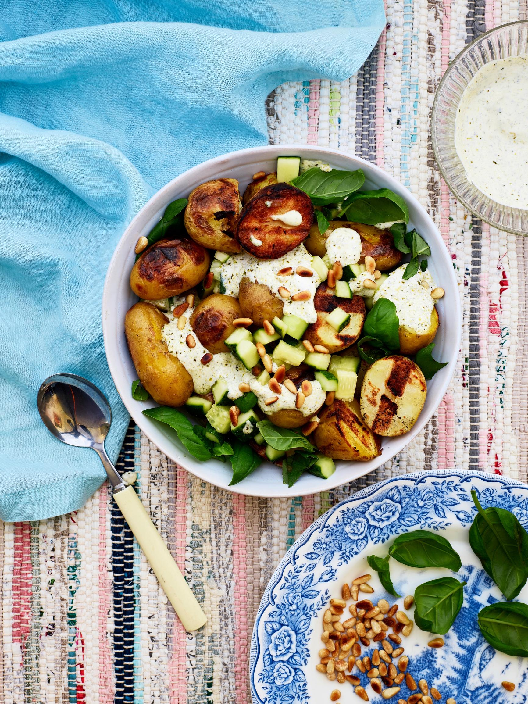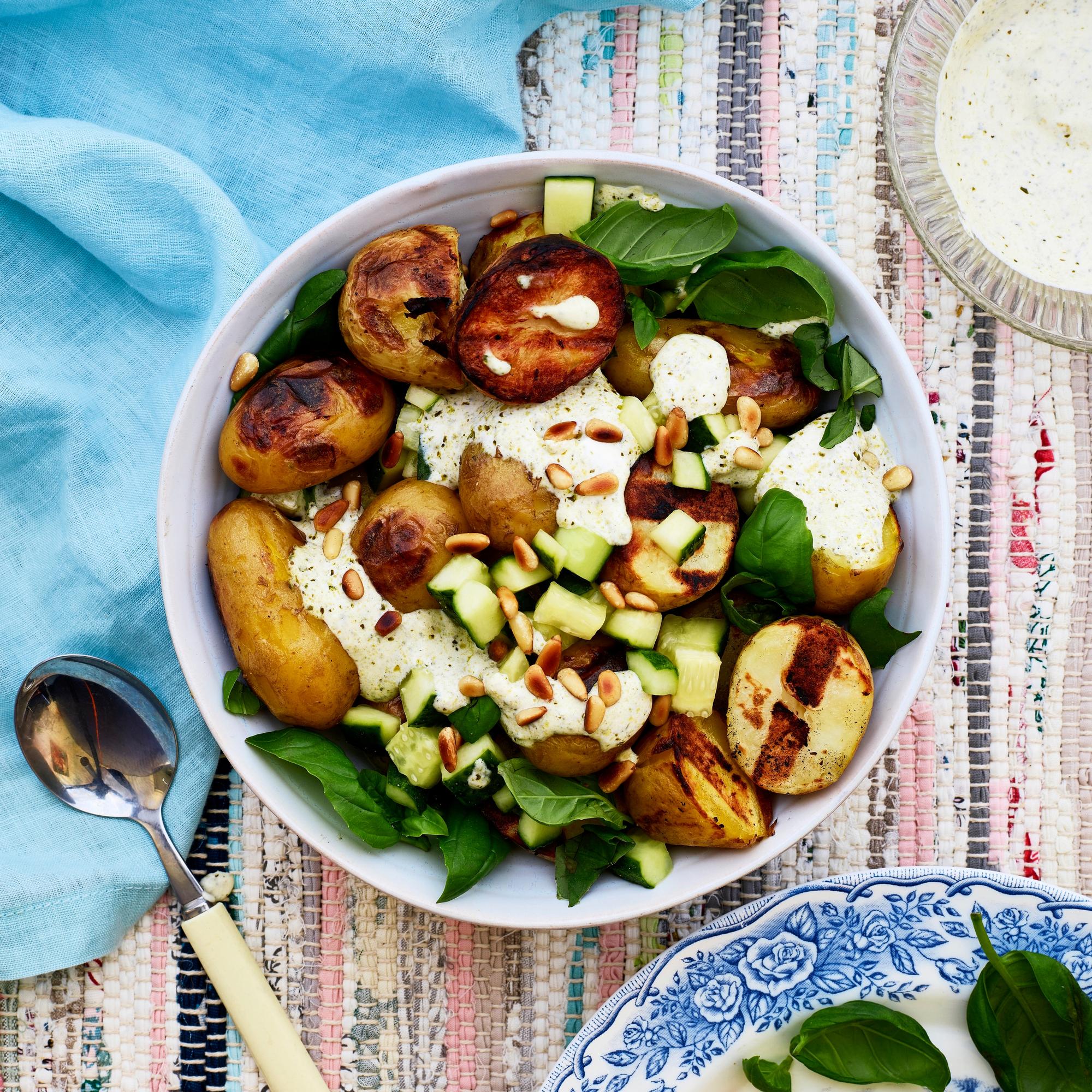 Grillattu perunasalaatti syntyy sukkelasti eilispäivän potuista – höystä salaatti mummonkurkuilla ja ranskankermakastikkeella!
