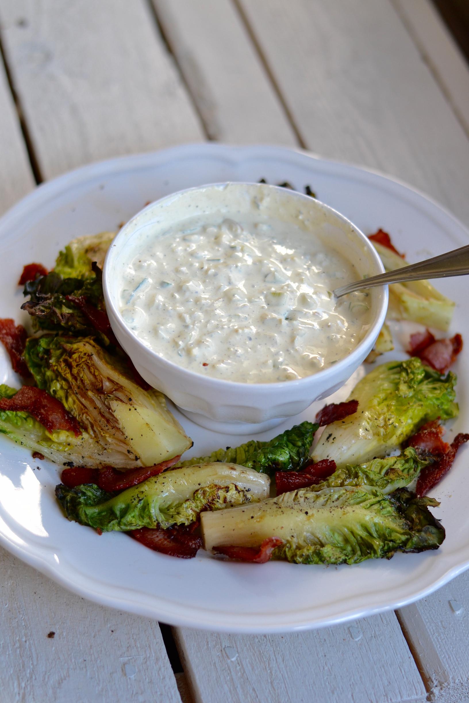 Grillattu sydänsalaatti homejuustokastikkeen kera on herkullista!