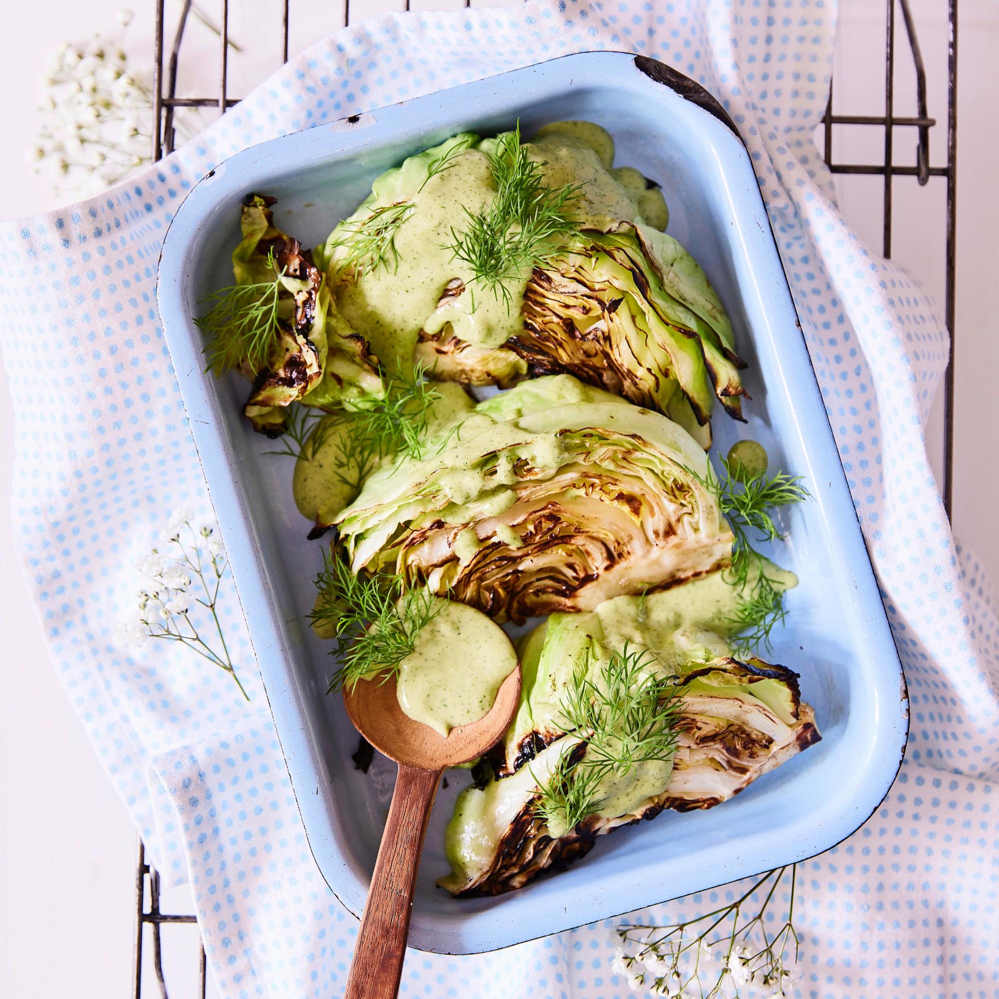 Grillattu varhaiskaali on huikeaa herkkua! Yrttinen kastike kruunaa rapsakat lohkot