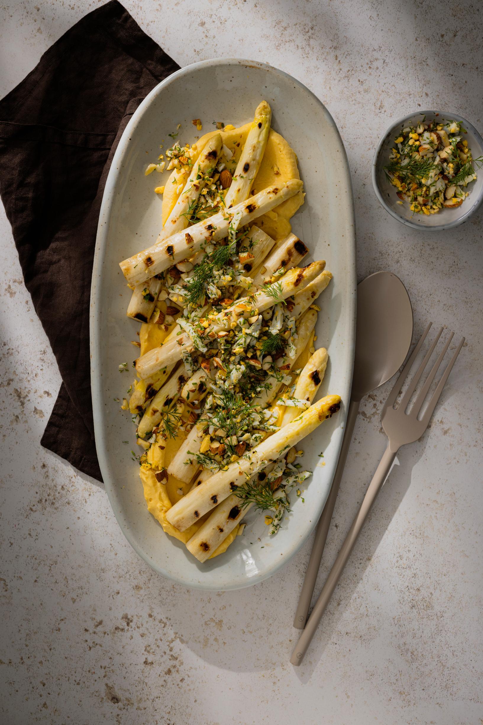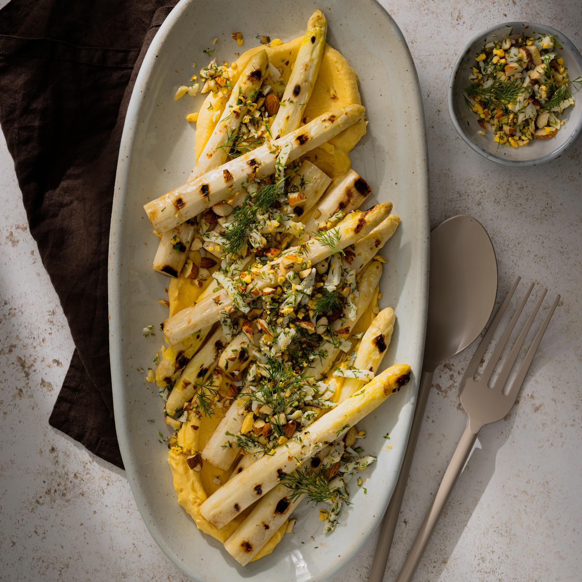Grillattua valkoista parsaa ja ruskistettua hollandaisekastiketta – tässä on kesäruoka parhaimmillaan!