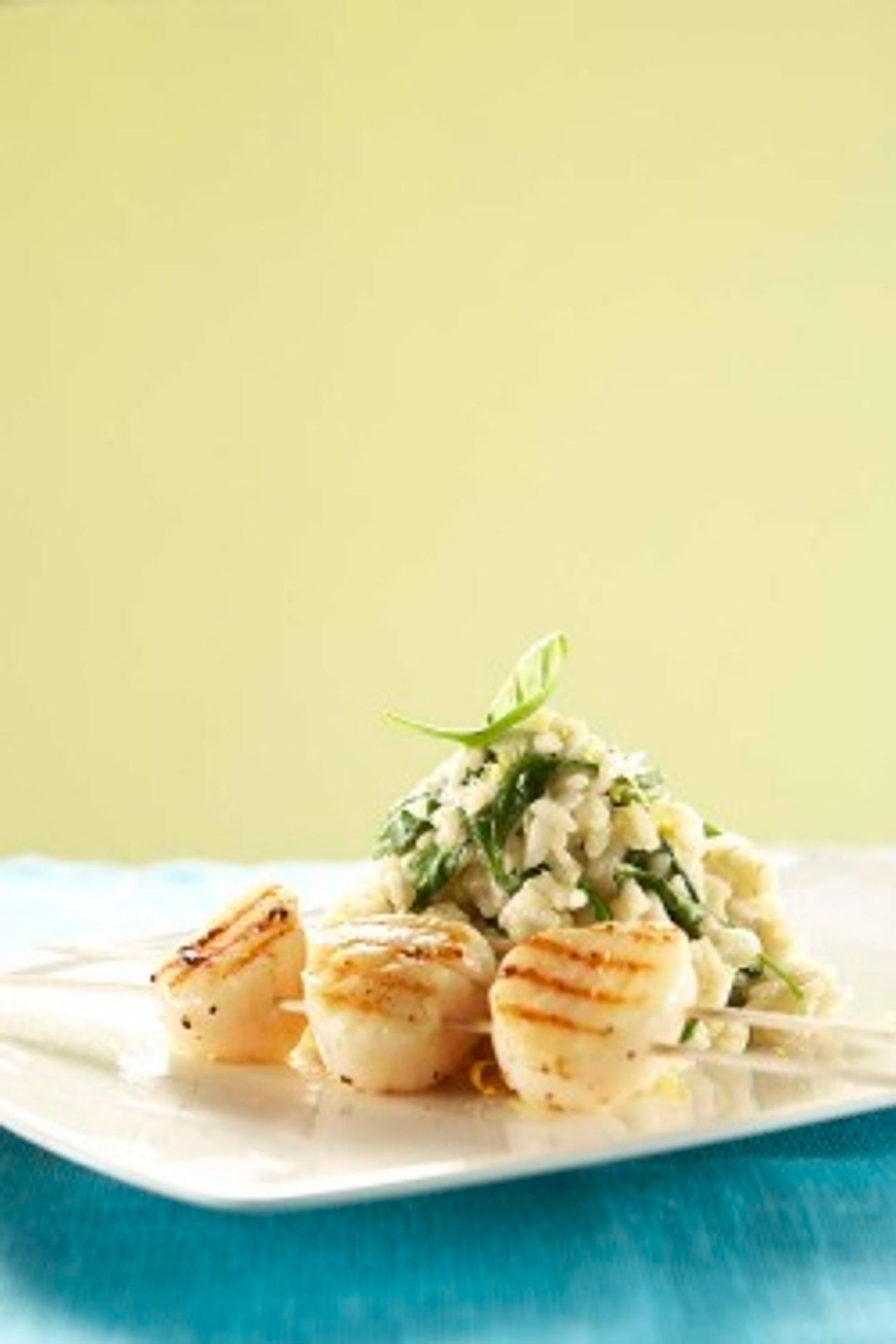 Grillattuja kampasimpukoita ja sitruuna-pinaattirisottoa
