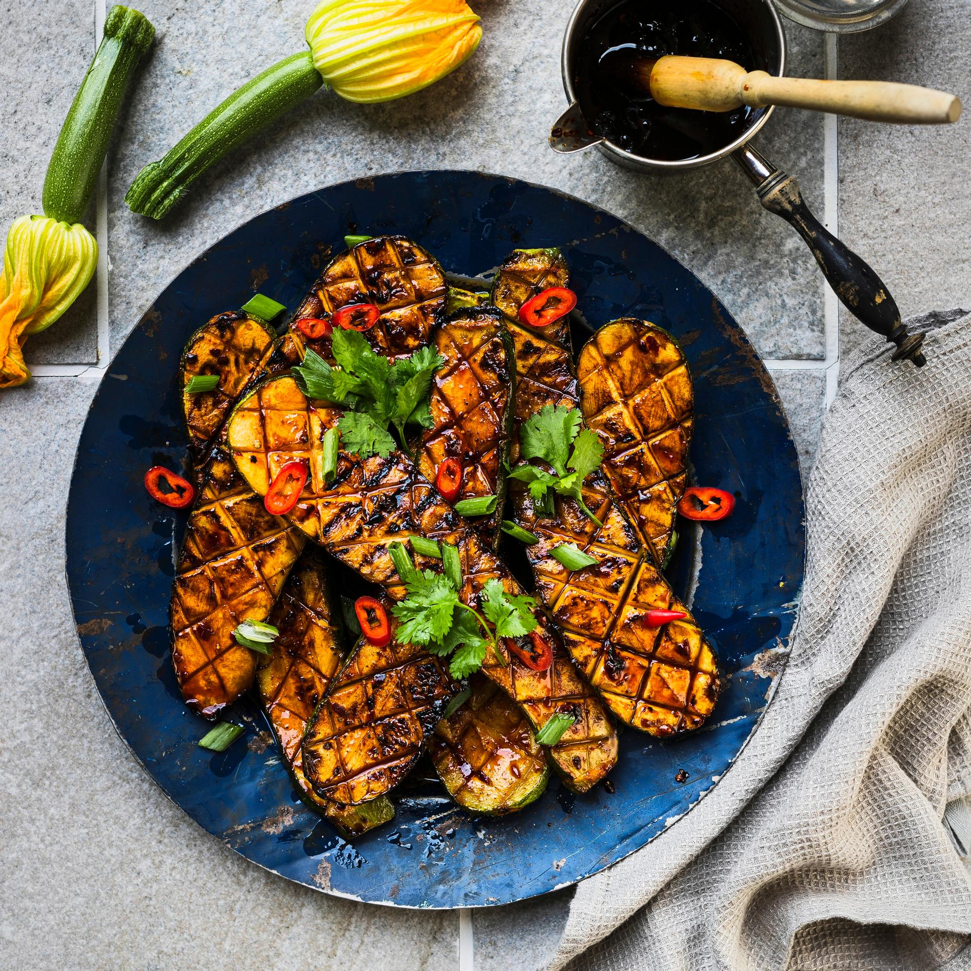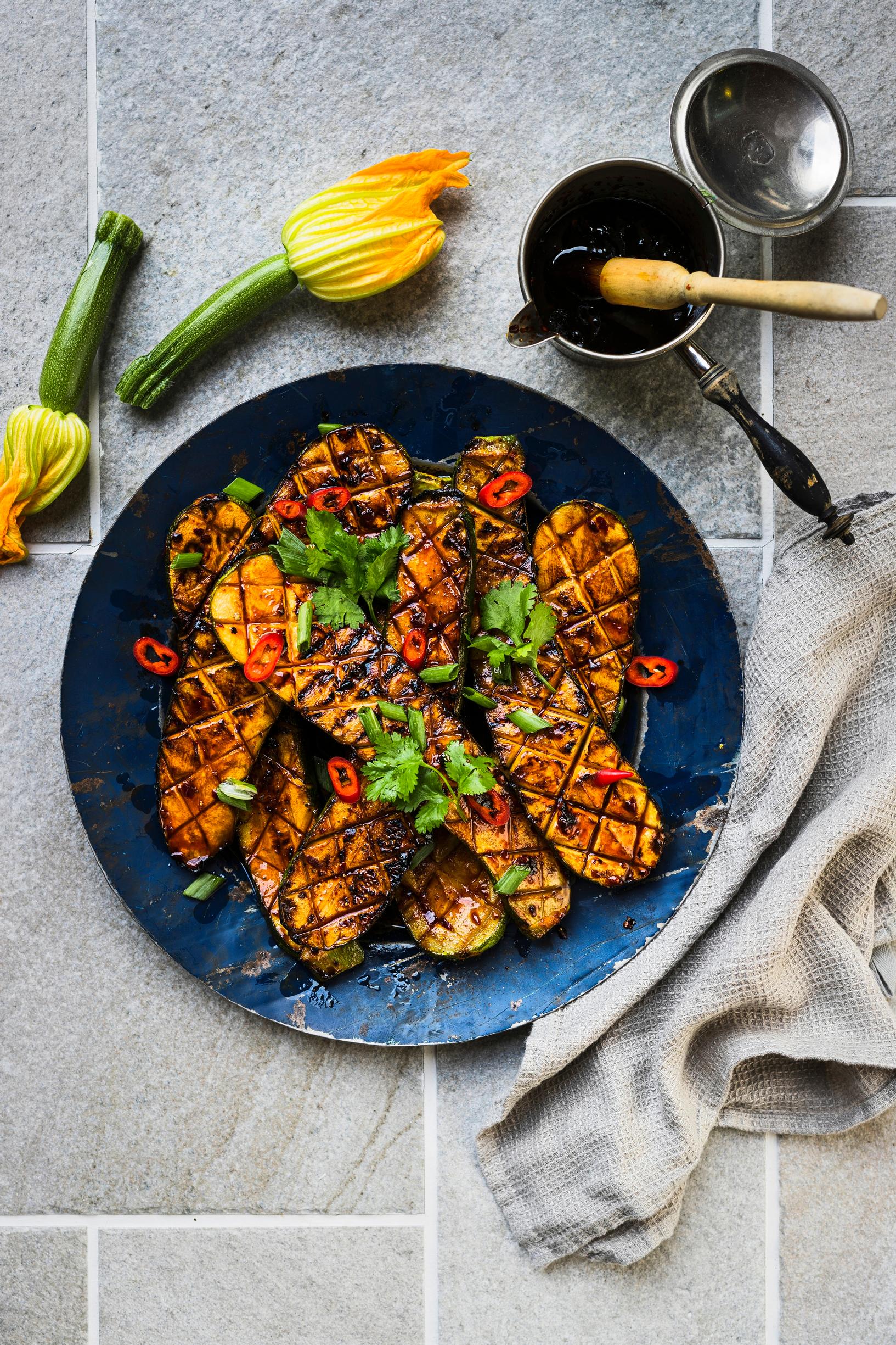 Grillattu kesäkurpitsa pulahtaa koukuttavan tahmaiseen marinadiin