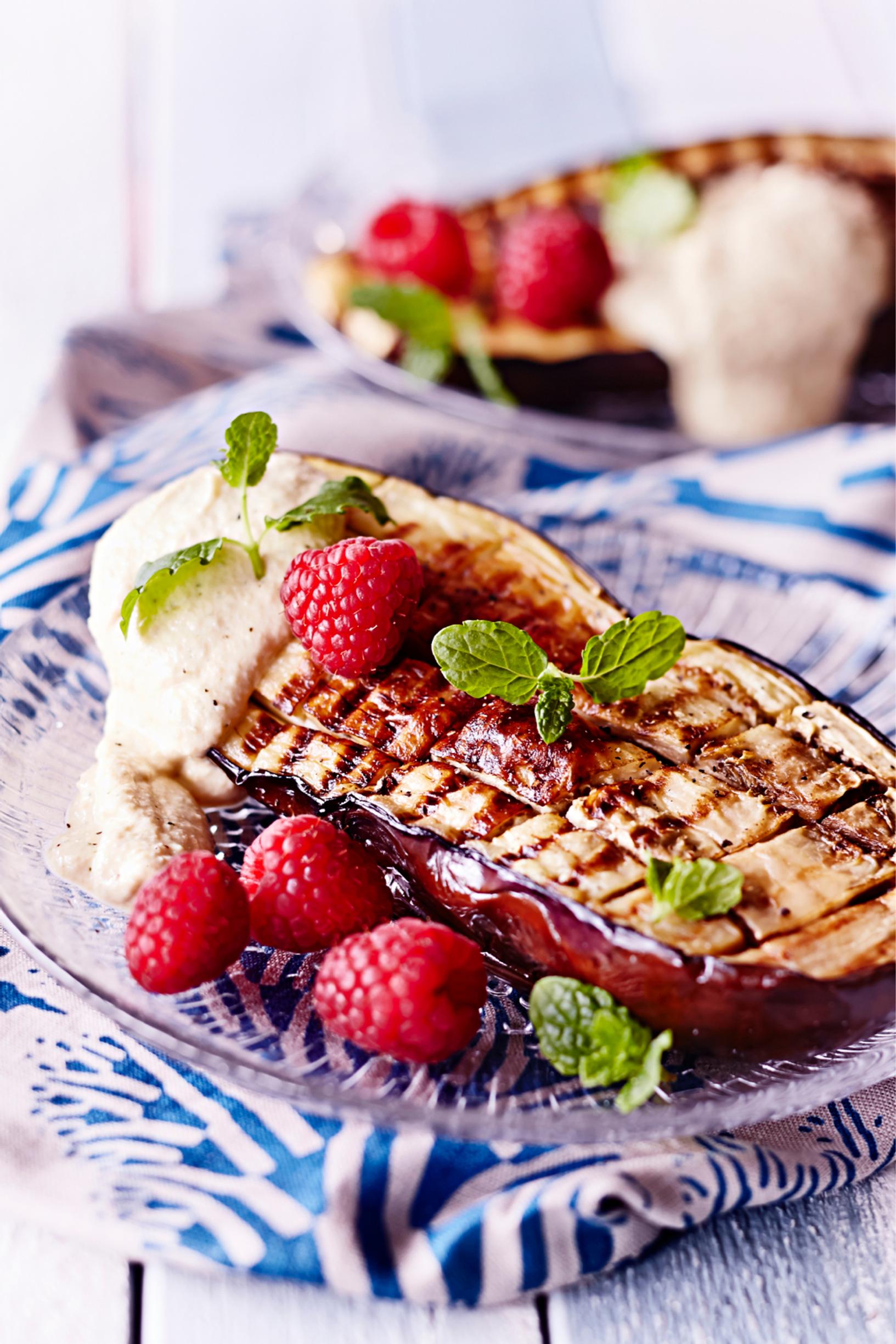 Mehevät grillatut munakoisot, samettinen hummusdippi ja raikkaat vadelmat muodostavat koukuttavan yhdistelmän. Kokeile sinäkin!
