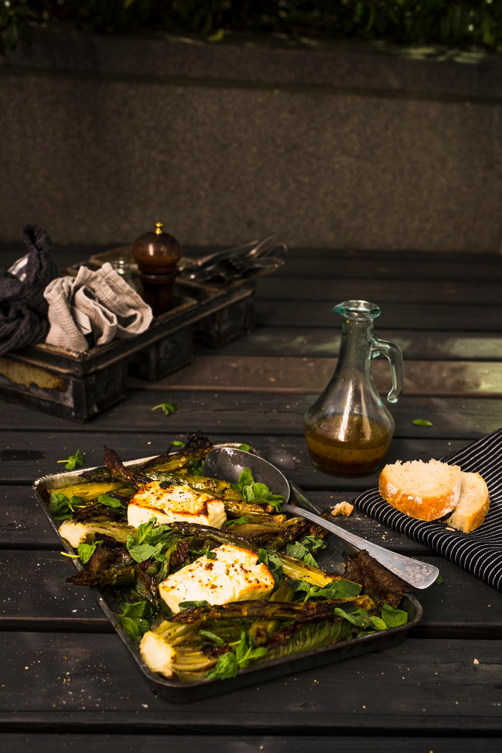 Voit kypsentää parsat ja fetan myös 200-asteisessa uunissa, noin 20–30 minuuttia, ja paahtaa salaatit parilapannulla.