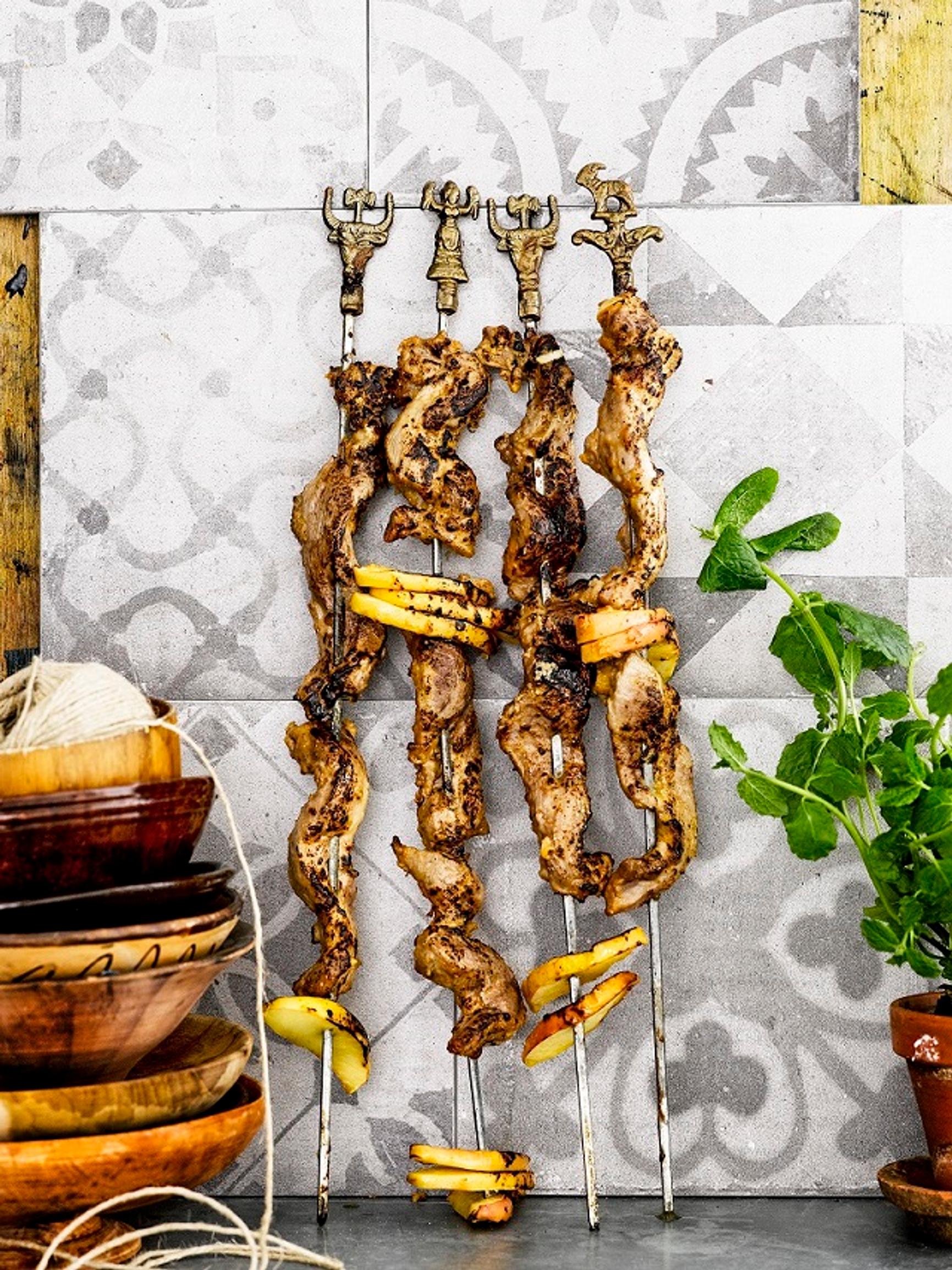 - Grillaa grillivartaita keskilämmöllä välillä käännellen noin 15 minuuttia, kypsennysaika riippuu possusuikaleiden paksuudesta. Voit kypsentää vartaat myös 225-asteisessa uunissa uunipellin päällä 20 minuuttia.