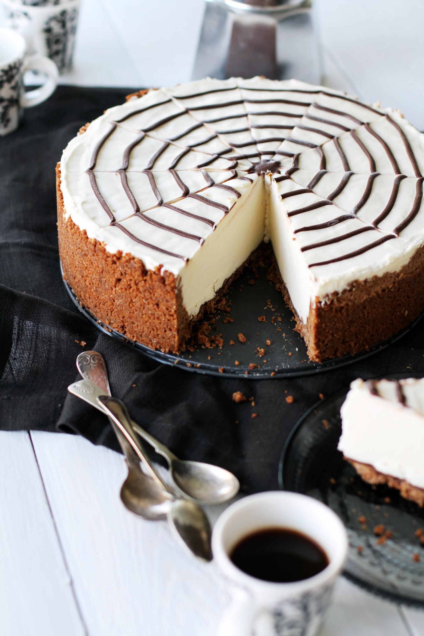 Halloween-juustokakku on hyytävä halloween-herkku! Ilman uunia tai liivatetta syntyvä halloween-juustokakku hyydytetään pakastimesta, ja sieltä sen voi näppärästi nostaa lokakuun lopun juhlapöytään. Suklainen hämähäkinverkko viimeistelee halloween-juustokakun!