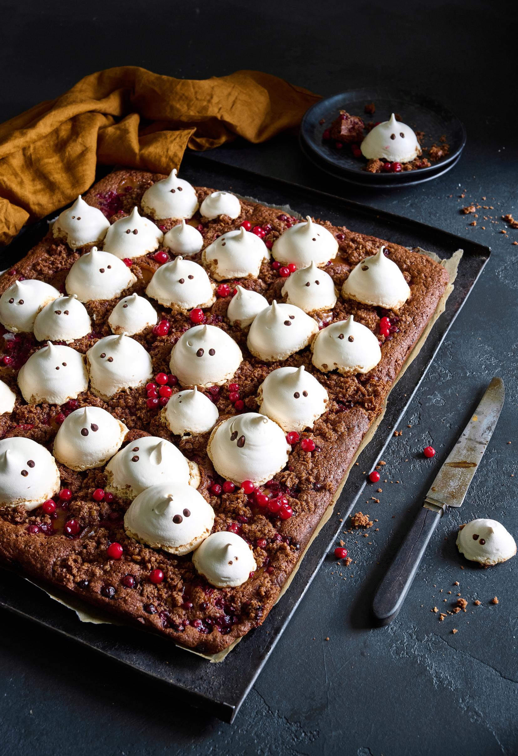 Haamupiirakka on syksyn hauskin leivonnainen. Kaakaokinuskipiirakassa on britakakusta tuttuja elementtejä, kuten ohut pohja ja rapea marenki. Pinnalla haahuilee joukko makeita marenkihaamuja. Böö!