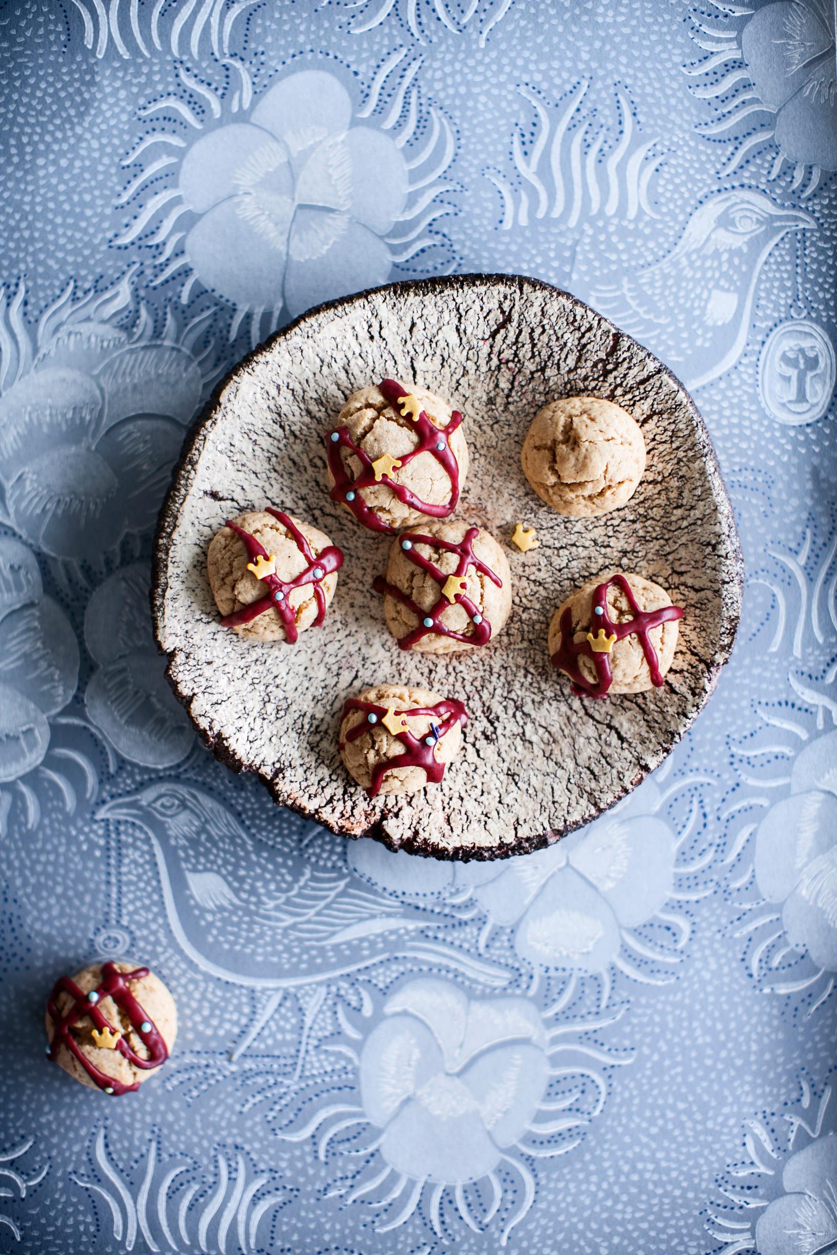 Hanna-tädin talkkunakakkujen päällä on mustikoilla värjätty tomusokerikuorrutus. Se kannattaa levittää kekseille vasta ennen tarjoilua. Jos tarjoat keksejä keliaakikolle, varmista, että käytät gluteenitonta talkkunaa.