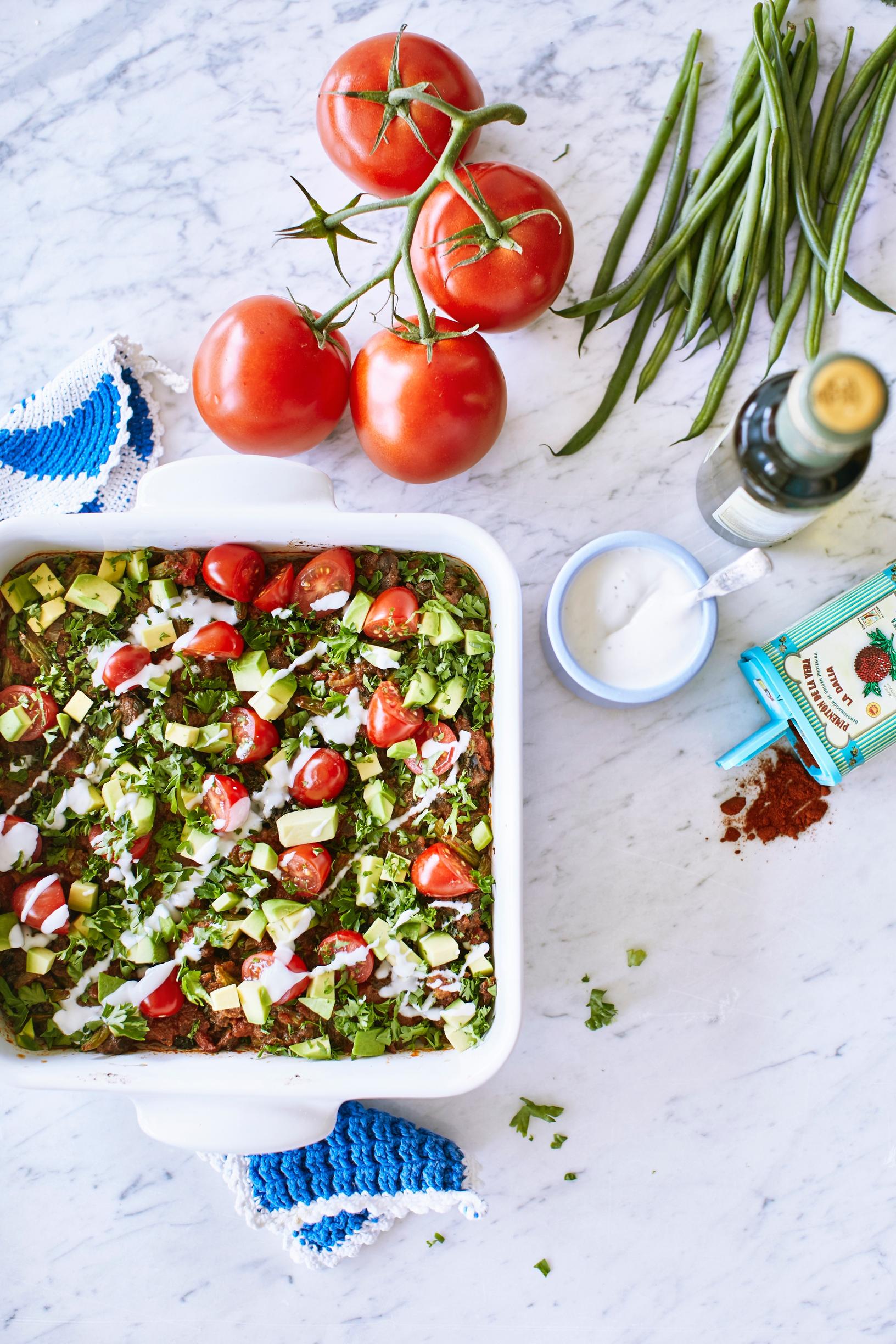 - Ota härkisvuoka uunista ja anna jäähtyä hetki. Ripottele tomaatit, avokadot ja persilja päälle. Tarjoa härkisvuoka kastikkeen kanssa.
