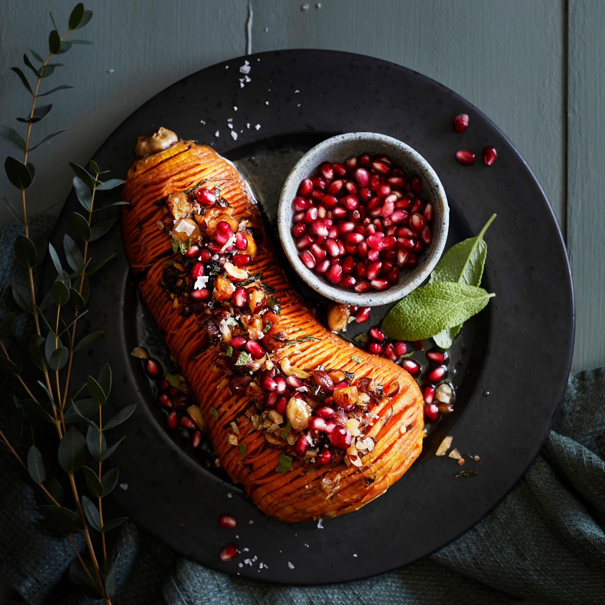 Hasselbackan kurpitsa on näyttävä vegaaninen herkku. Ras el hanout -mausteseoksella loihdit vaivattomasti marokkolaishenkisen makumaailman. Lisäsävyjä tuovat salvia ja granaattiomenan siemenet.