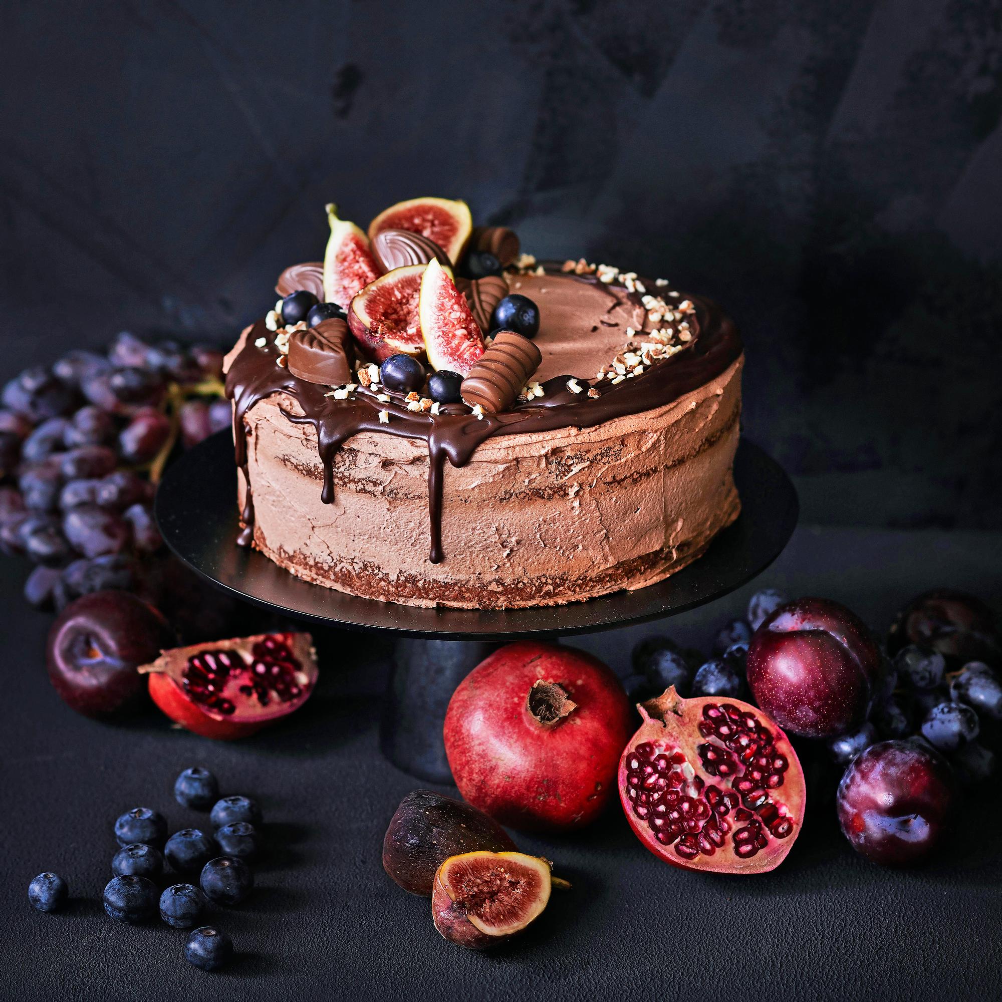 - Koristele hasselpähkinäkakun pinta kokonaisilla ja rouhituilla pähkinöillä. Lisää päälle mustikoita, lohkottuja viikunoita ja suklaakonvehteja.