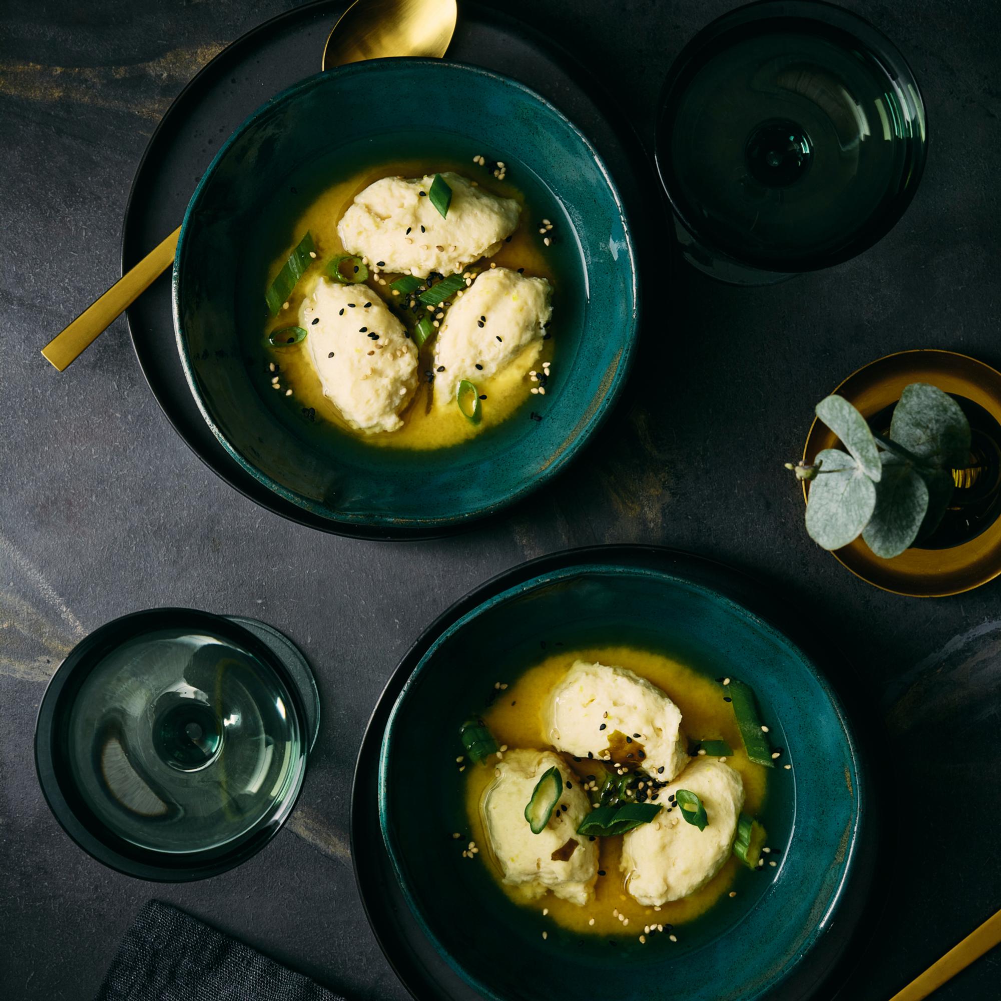 Samettisen pehmeät kvenellit ovat hienostuneempi versio haukipyöryköistä. Ramenkeitosta tuttu misoliemi antaa niille sopivan suolaisen maun.