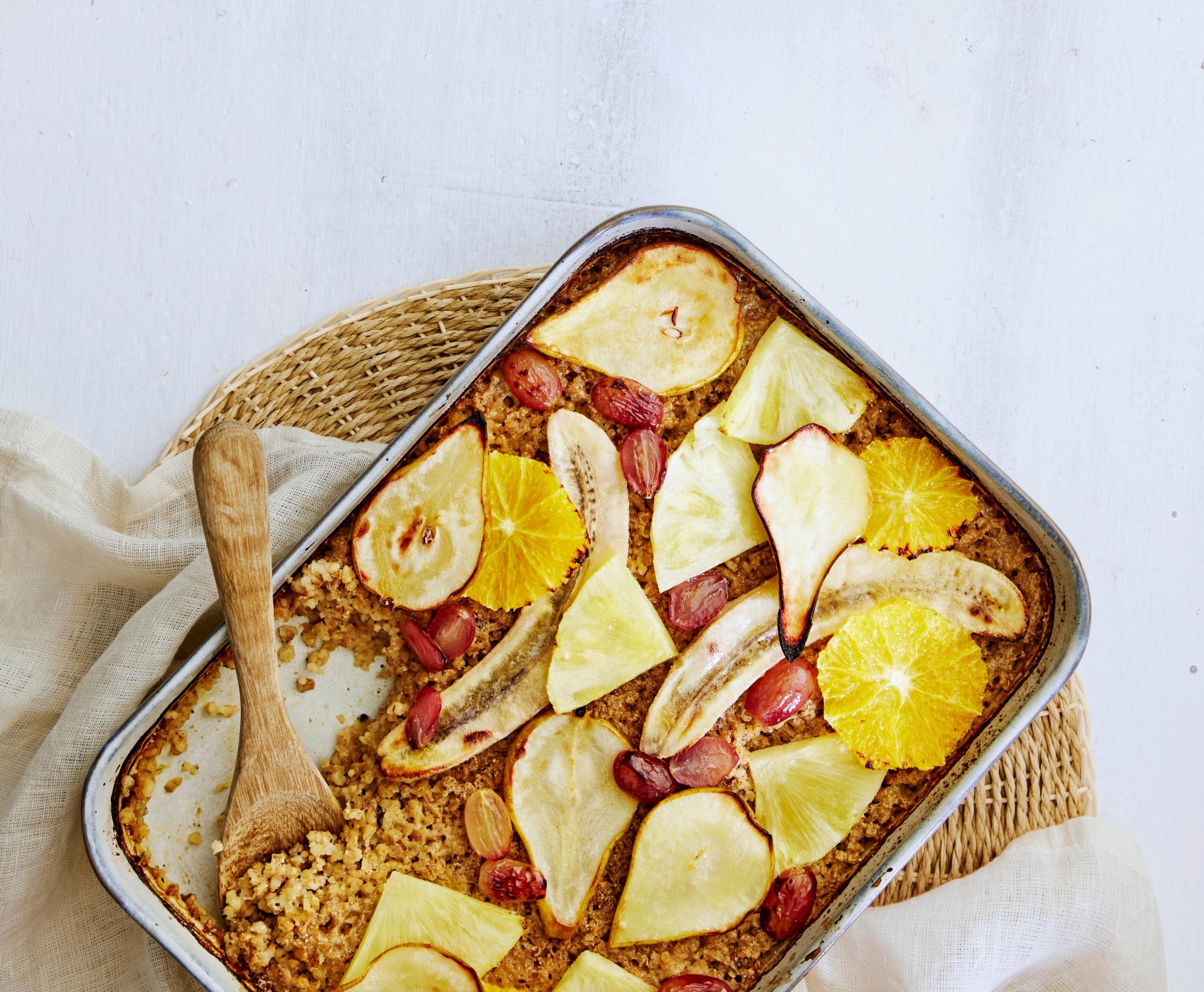 Hedelmäinen uunipuuro aloittaa aamun makoisasti. Viipaloi puuron päälle lempihedelmiäsi, kuten ananasta, päärynää, banaania ja rypäleitä. Nappaa helppo ohje!