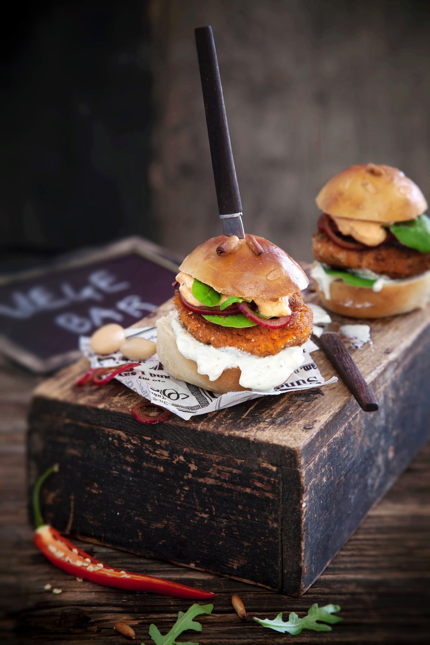 Mehevä ja sopivan tulinen vegehampurilainen syntyy näistä: kaksi herkullista kastiketta, pikkelöidyt punasipulit ja paneroidut bataatti-papupihvit. Nam!
