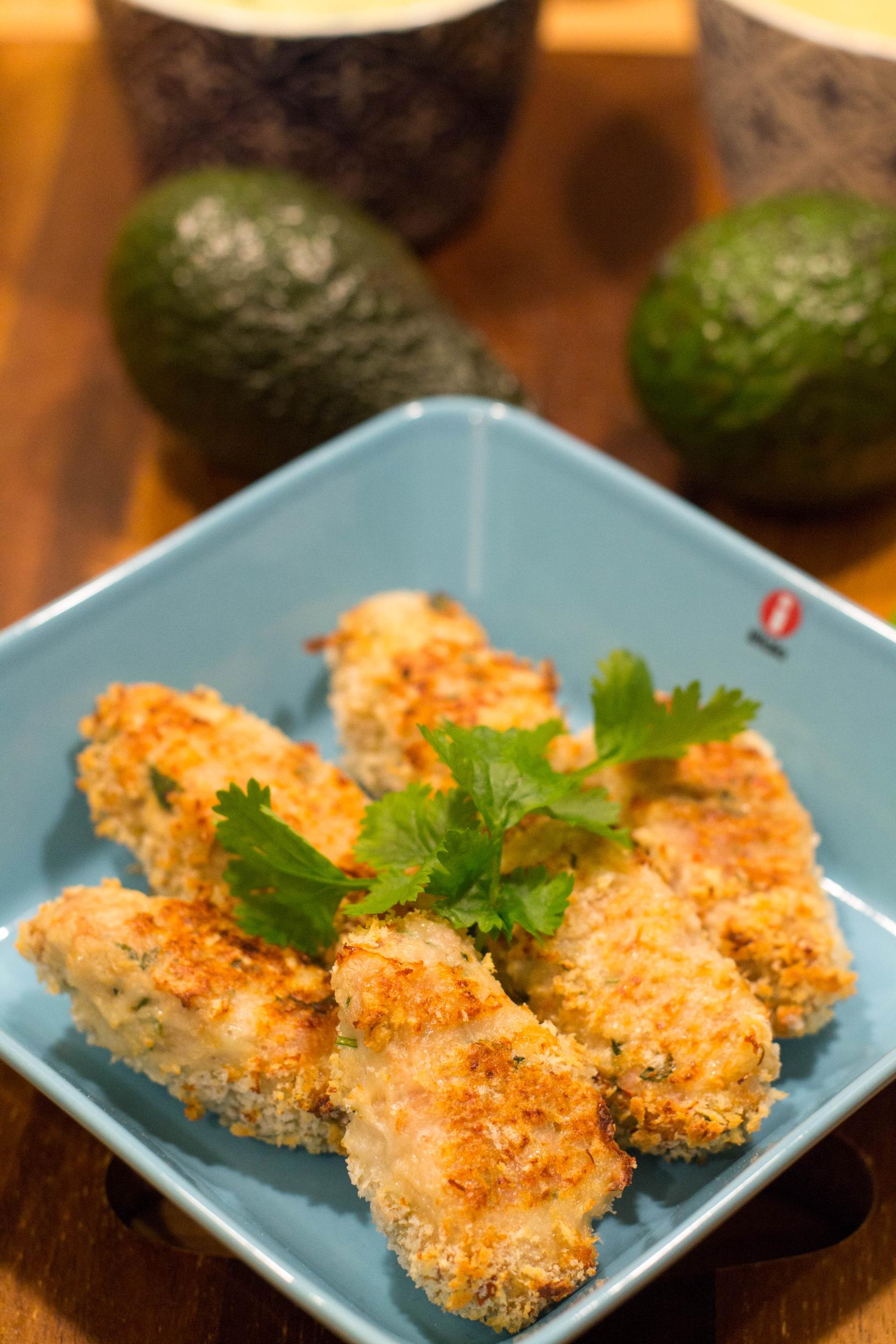 Tarjoile kananugetit avokadodipin, srirachamajoneesin, mangosalaatin ja korianterikurkkujen kera.