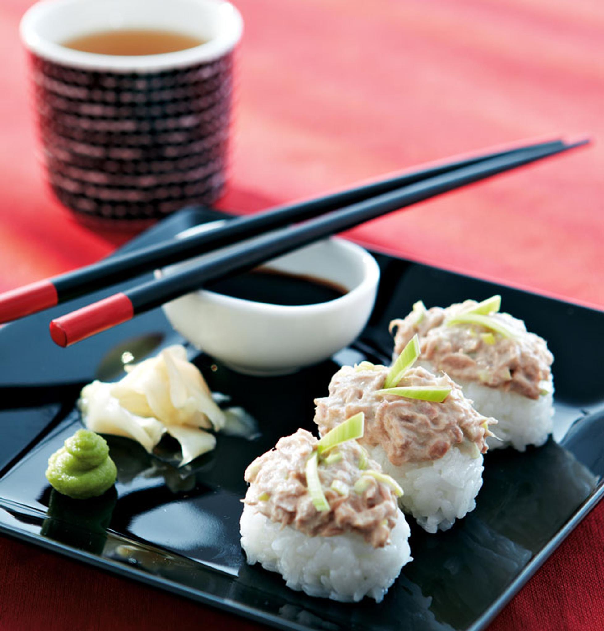 - Muotoile riisistä puhtain käsin vähän kananmunaa pienempiä soikioita. Levitä jokaiselle tonnikalaseosta.