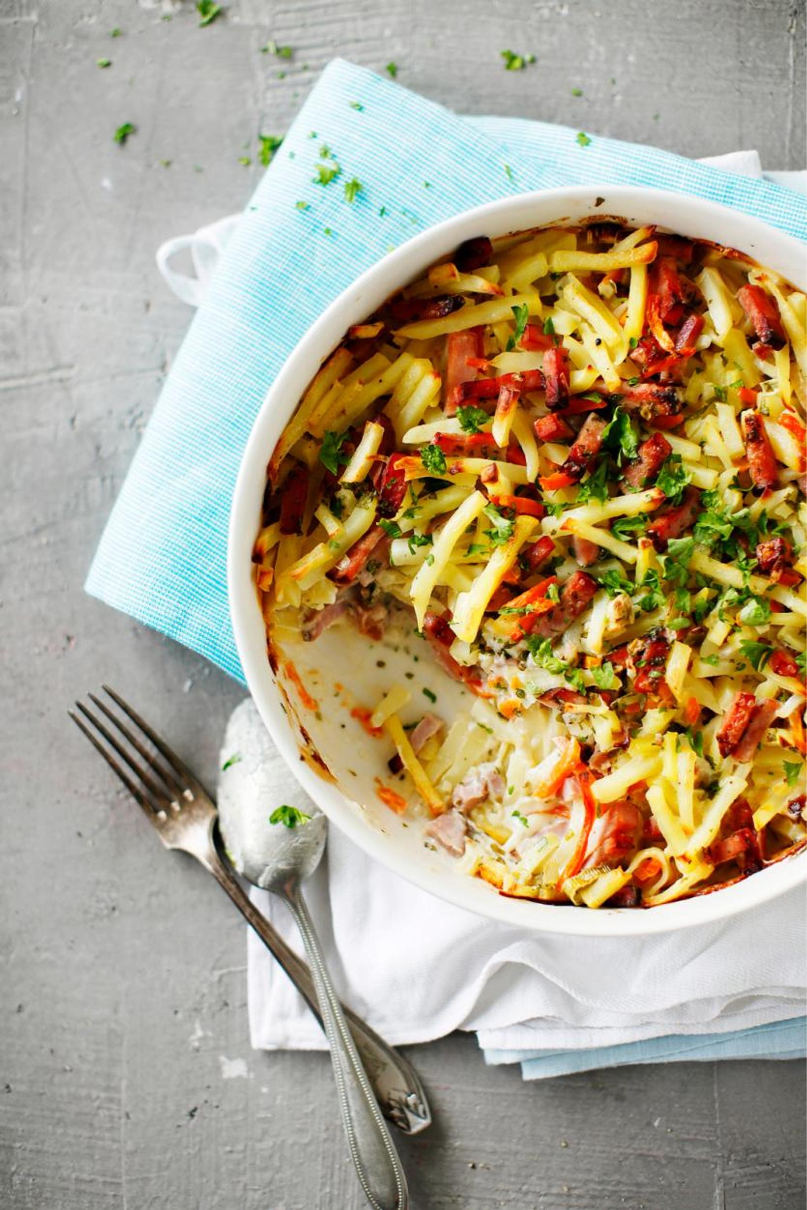- Kaada peruna-sipulisekoitus ja kasvissekoitus kulhoon. Sekoita joukkoon kinkkusuikaleet ja persilja.