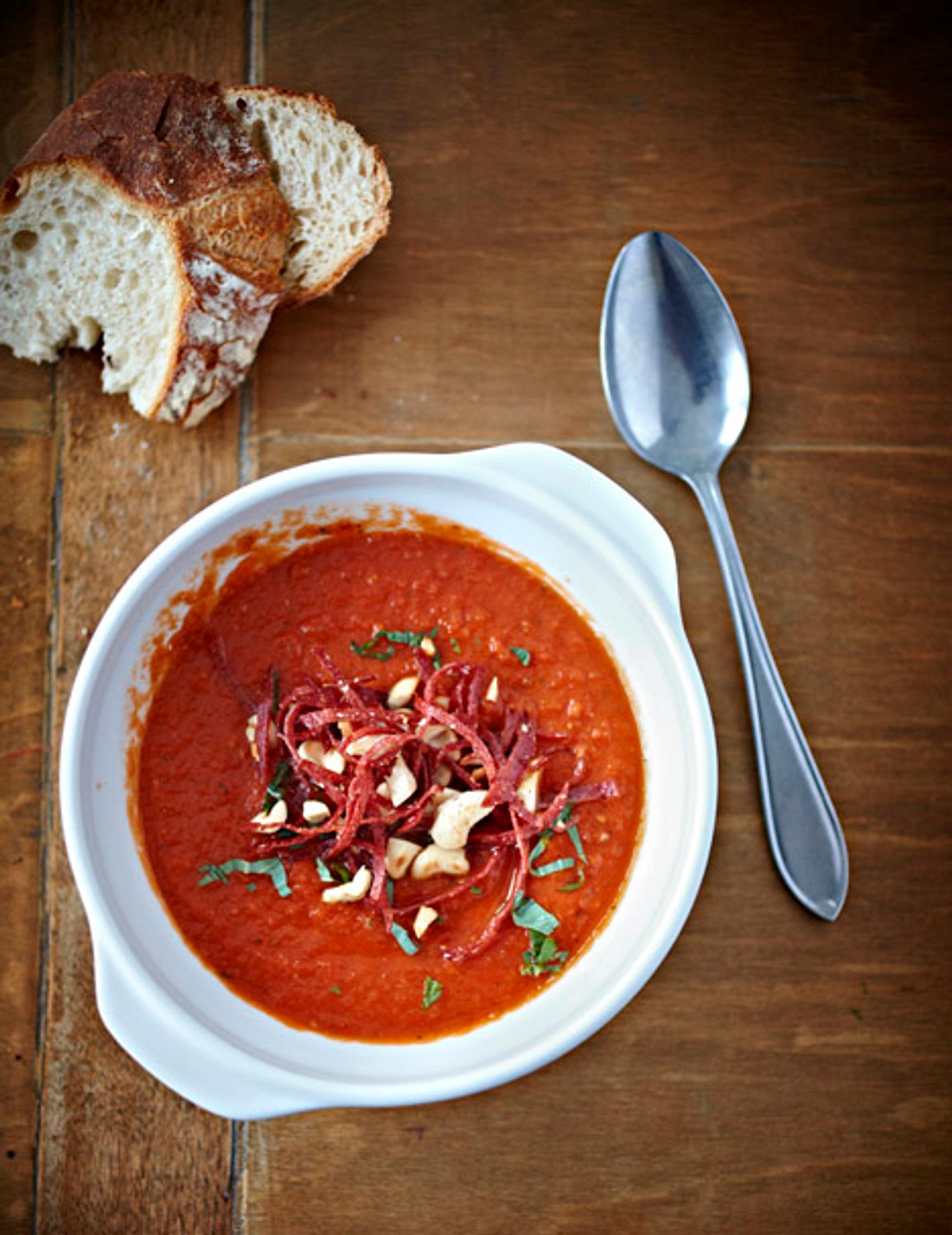 Helppo tomaattikeitto valmistuu 20 minuutissa. Herkullinen keitto saa täyteläisyyttä aurinkokuivatuista tomaateista ja ruokaisuutta rapeaksi paahdetusta meetvurstista ja cashewpähkinöistä.