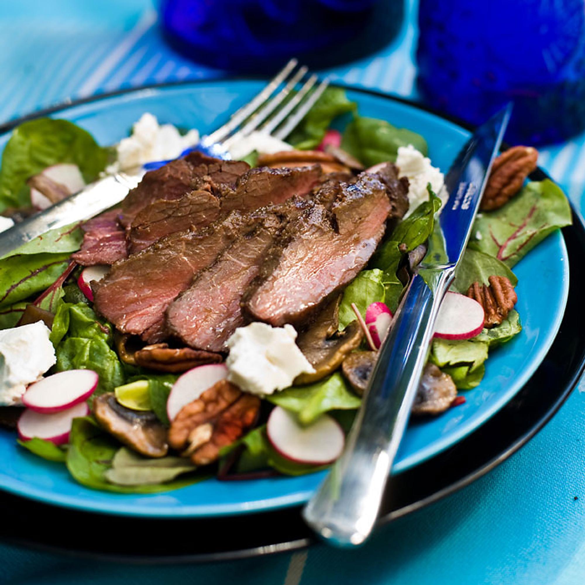 Nosta viipaloitu pihvi herkkusieni-pinaattisalaatin päälle. Pirskota salaatin päälle hieman hyvää oliiviöljyä.