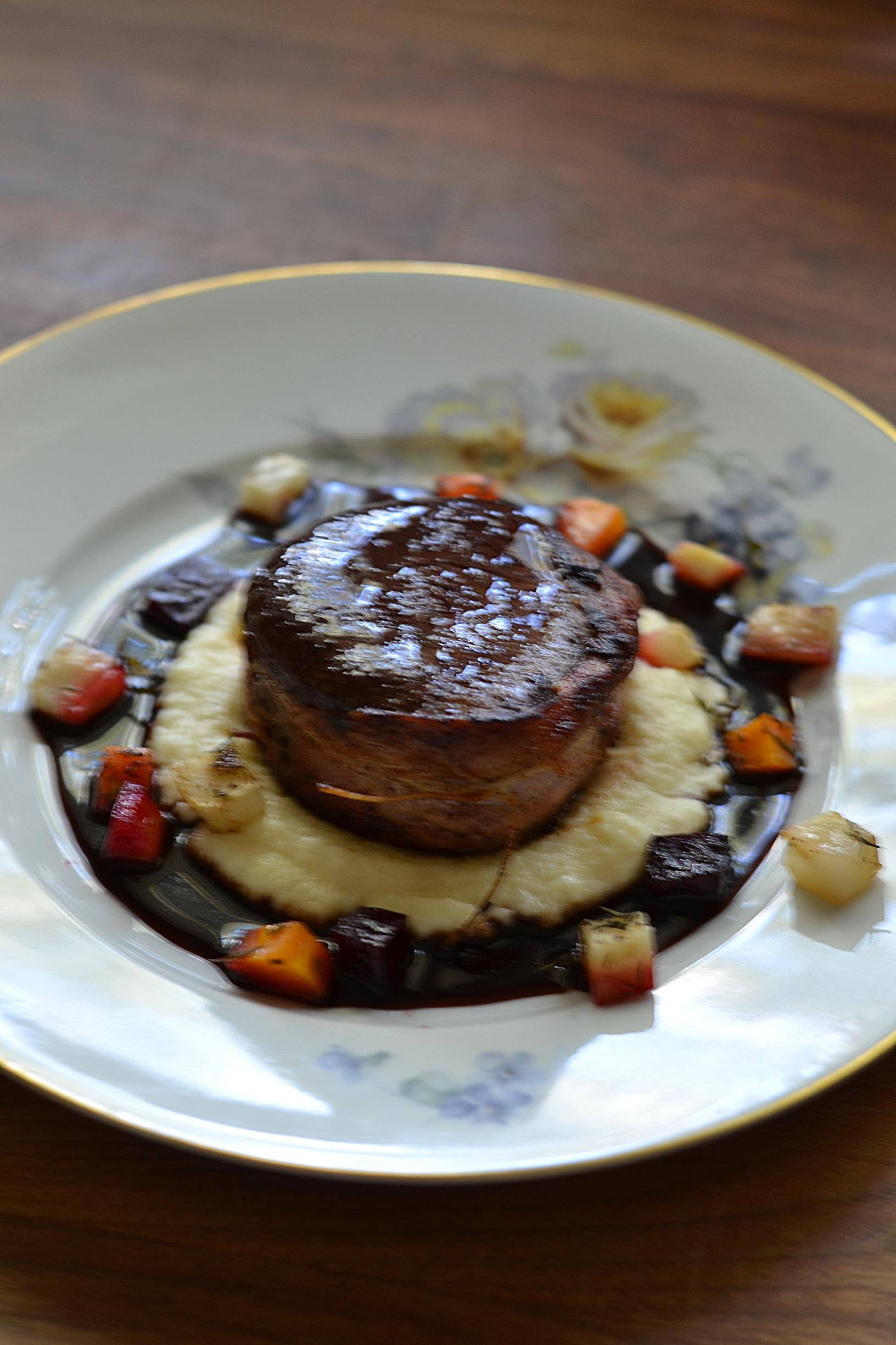 Tarjoile hirven tournedos pihvit palsternakkapyreen, punaviinikastikkeen ja hunajaisten uunijuuresten kera.