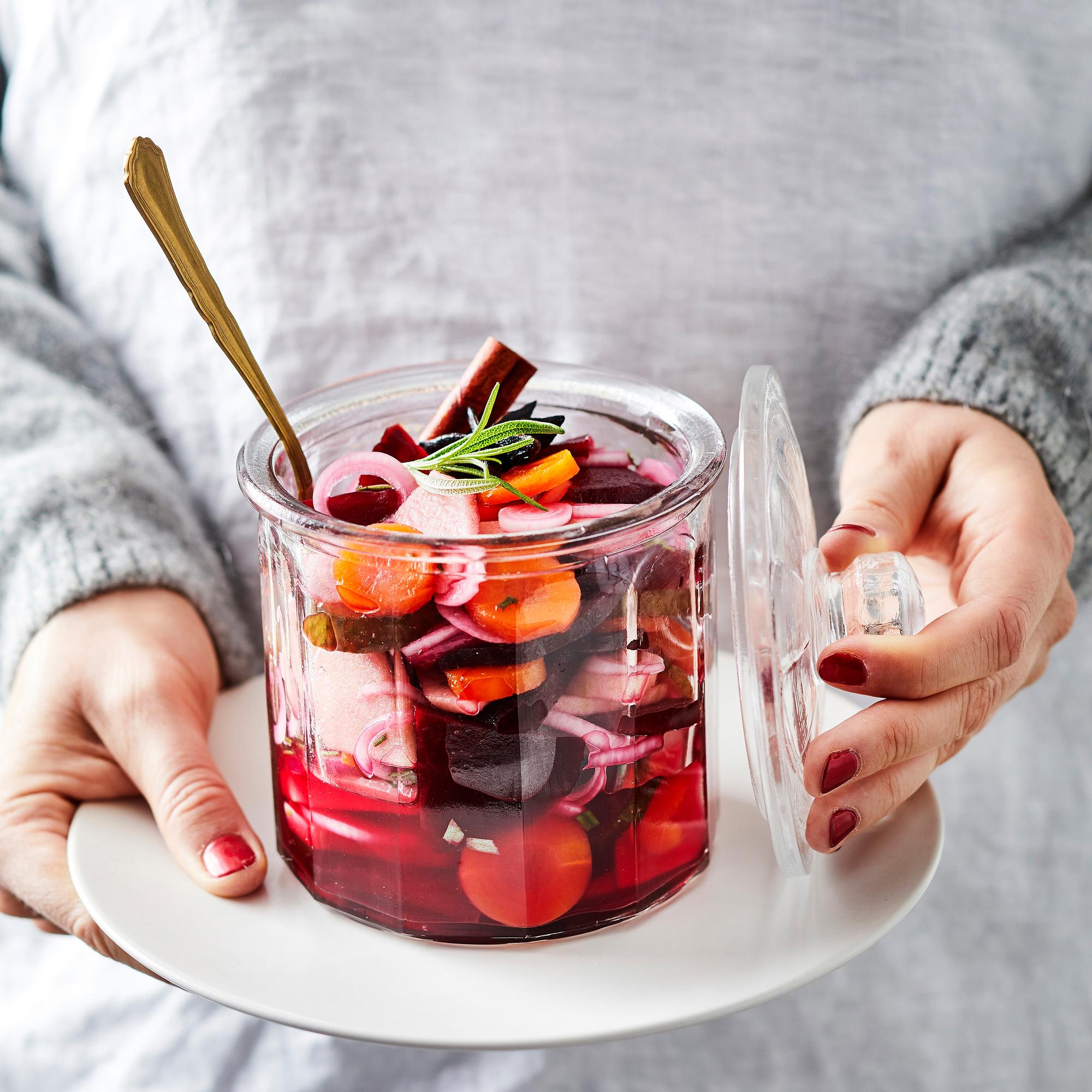 - Kuori ja viipaloi punajuuret ja porkkanat. Kuori ja viipaloi sipuli. Kuori omena, poista siemenkota ja leikkaa omena neljäksi lohkoksi ja viipaloi lohkot. Viipaloi myös maustekurkku.