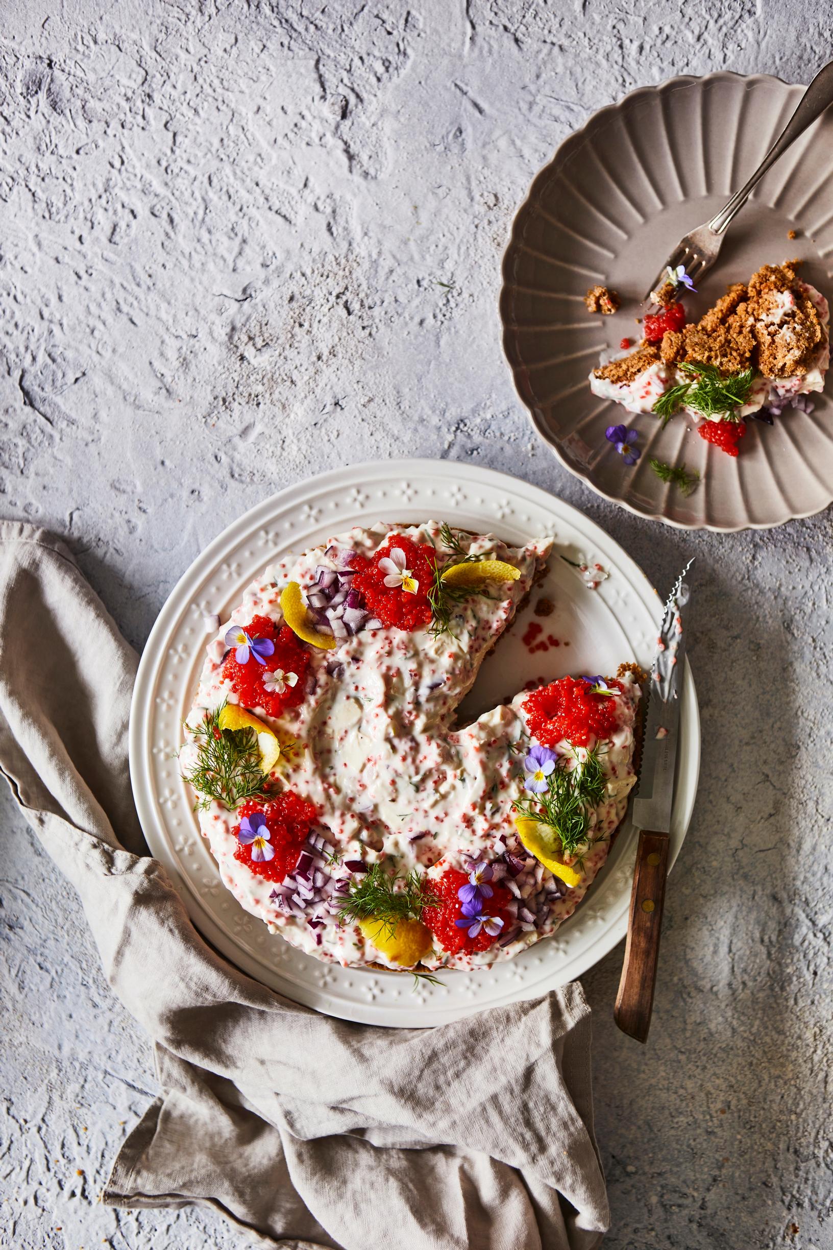 Tässä vegaanisessa kakussa skagen tehdään katkarapujen sijaan tofusta. Merileväkaviaarilla koristeltu kakku on juhlapöydän näyttävin ilmestys!
