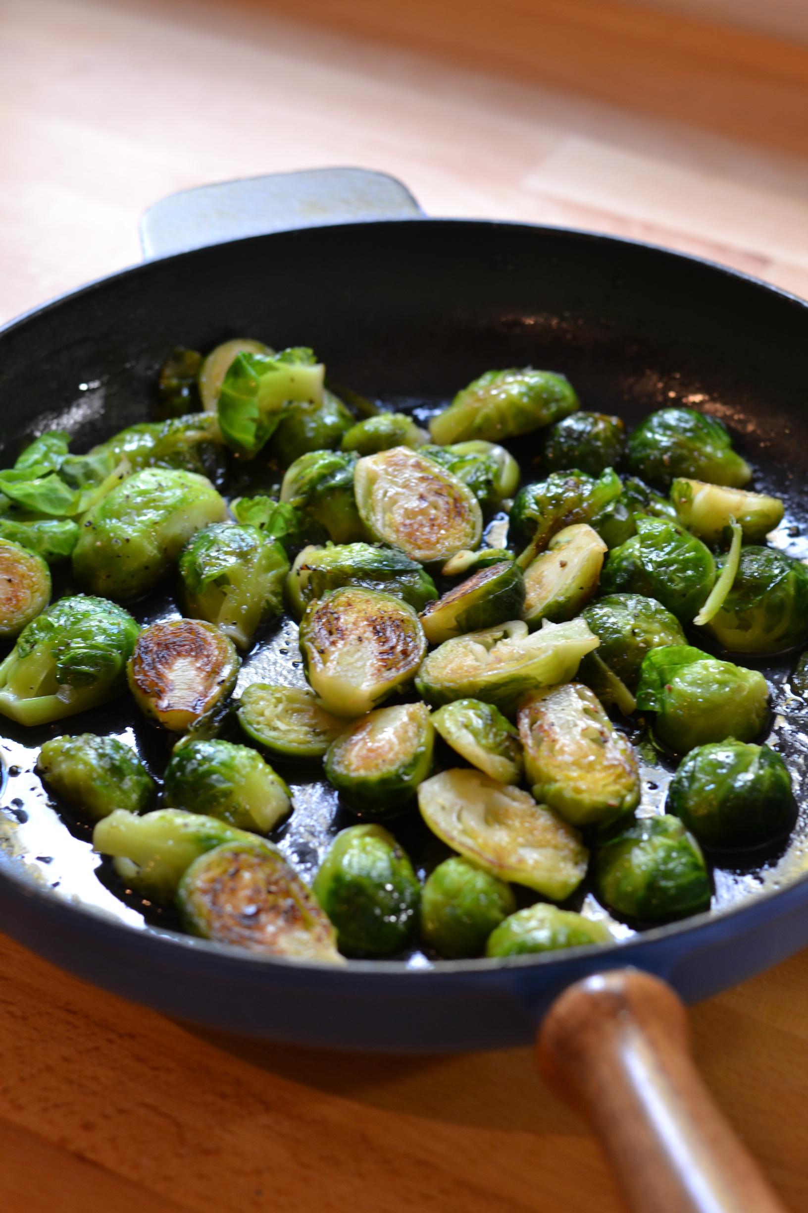 - Sulata voi pannulla. Lisää ruusukaalit kuumaan pannuun. Paista noin 5 minuutin ajan tai kunnes molemmat puolet ovat saaneet väriä.
